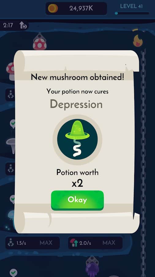 Magic Mushrooms – клікер на андроїд, де ви будете створювати зілля. У грі ви зможете відчути себе алхіміком і перетворювати гриби зілля для того щоб вилікувати весь світ. Виконуйте різні місії і квести заради благої справи і послужите на благо всього людства. Станьте першим хто створить зілля, яке зцілить усі хвороби і заробити свої перші мільйони. Поєднуйте однакові гриби і отримуйте абсолютно нові види, які потрібні вам для інгредієнтів зілля. Збирайте всі потрібні інгредієнти і займайтеся дослідженнями.