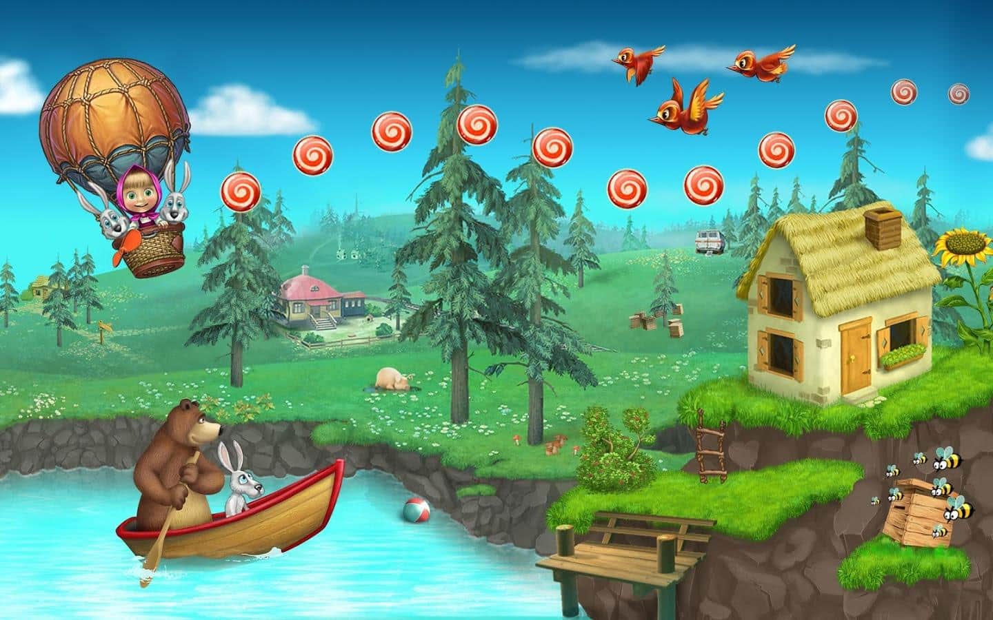 Маша и Медведь: Игра - наступила весна, и большое количество снега начало таять, создавая при этом губительный паводок. Смелая и отважная Маша, летая на воздушном шаре должна летать и спасть зайчат от неминуемой гибели. Эта игра была создана специально для детей младших возрастов, где они будут играть с давно полюбившимися героями мультсериала.