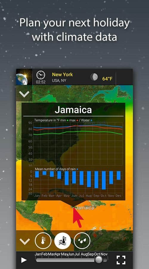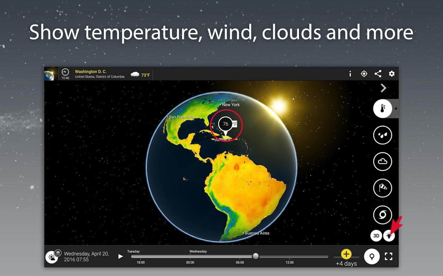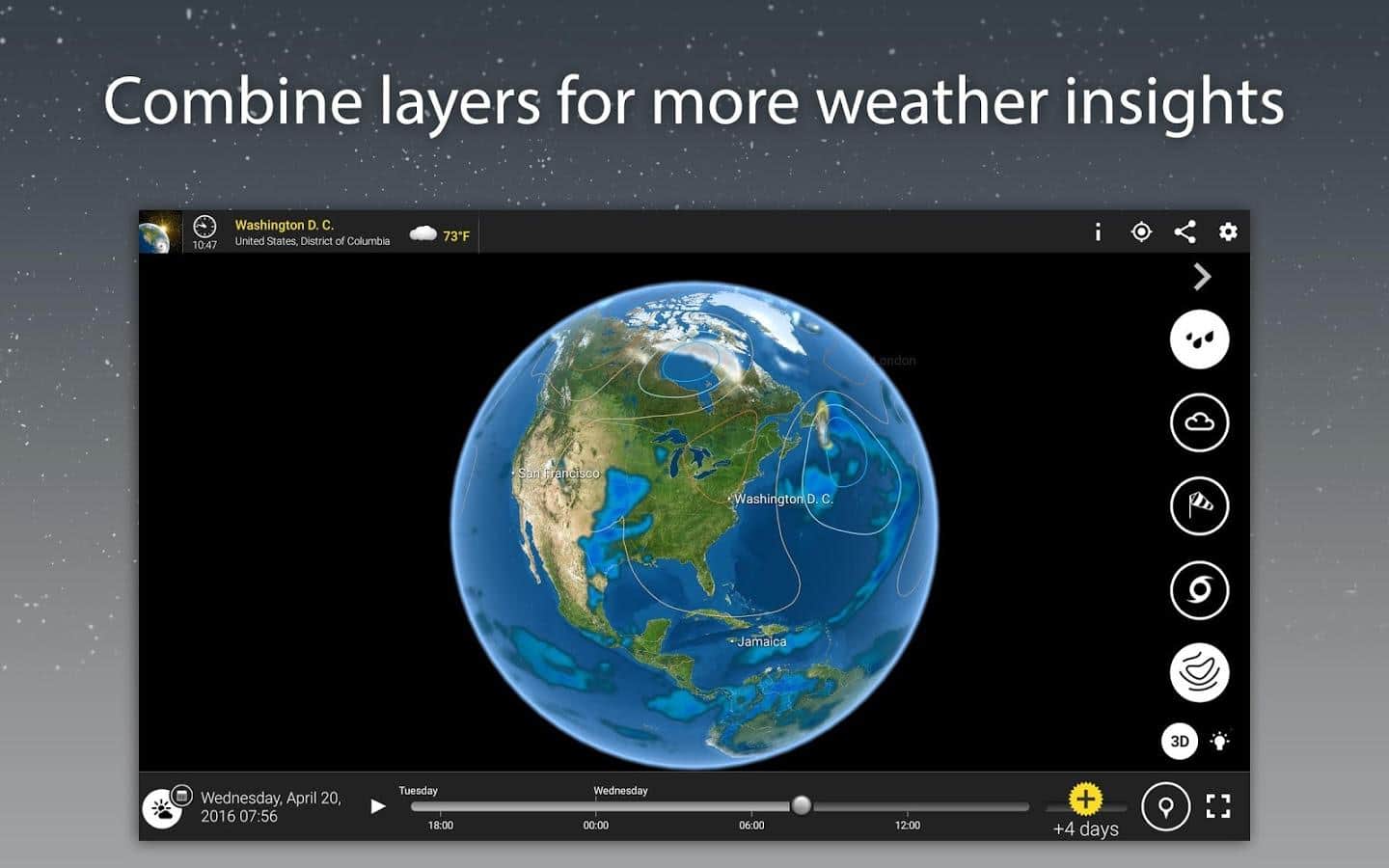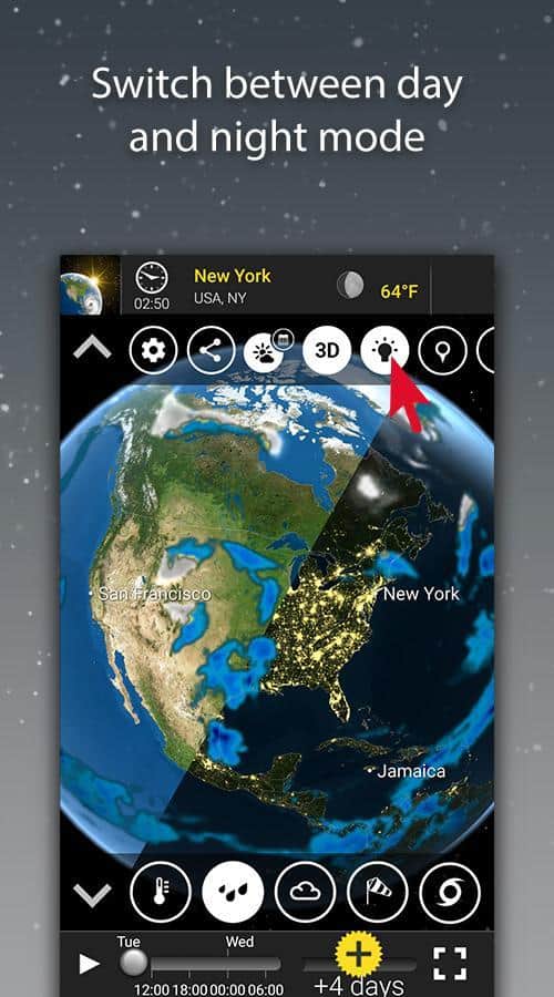MeteoEarth - Відмінне додаток для відстеження змін в погодних умовах. Це погода, яку ви самі можете помацати. Об'єднуючи в собі відмінне тривимірне зображення, і ігрову простоту, ця програма є просто ідеальним для перегляду на погодні зміни. Ви можете обертати земну кулю як вам завгодно, і переглядати погодні зміни на окремих його ділянках.