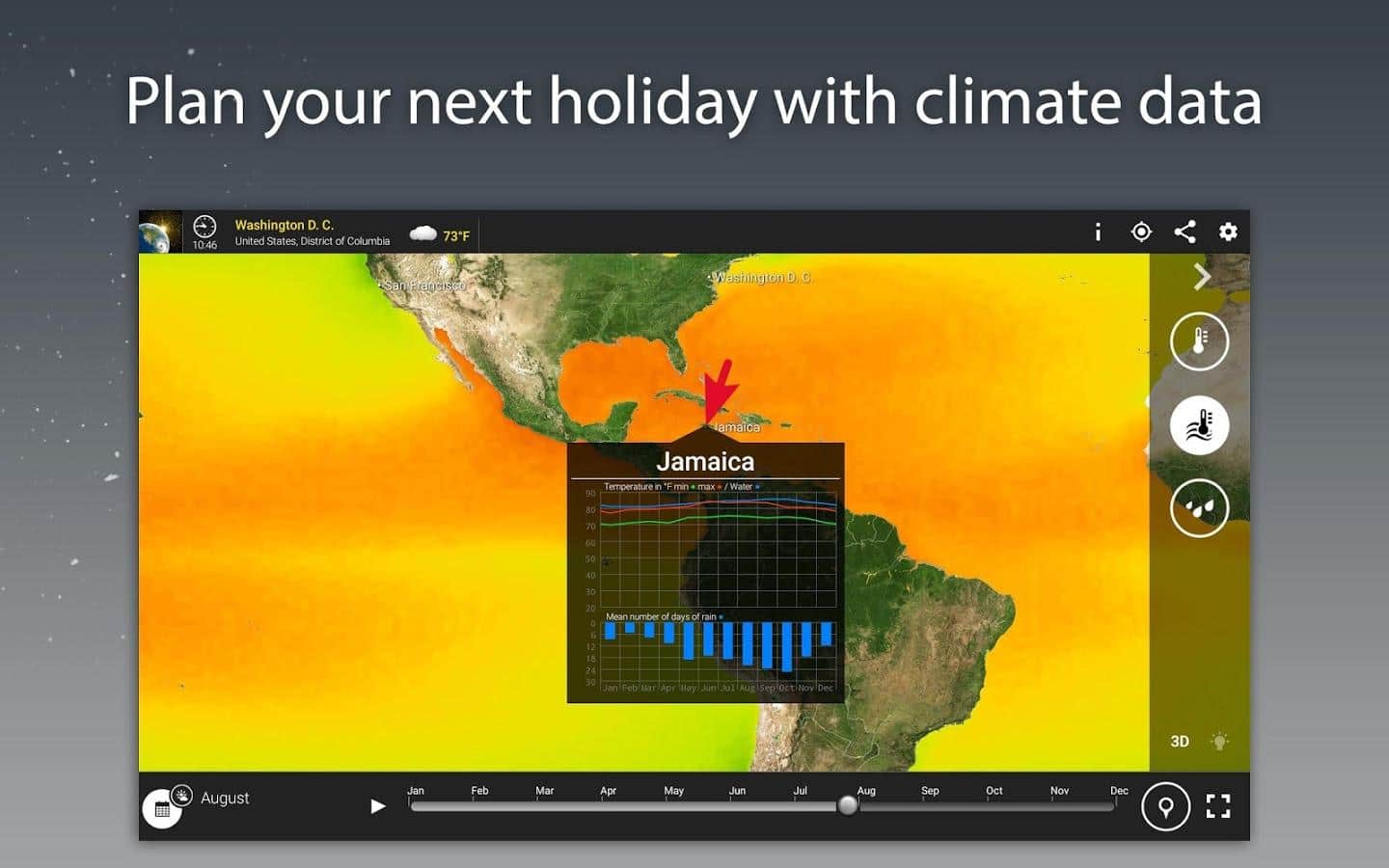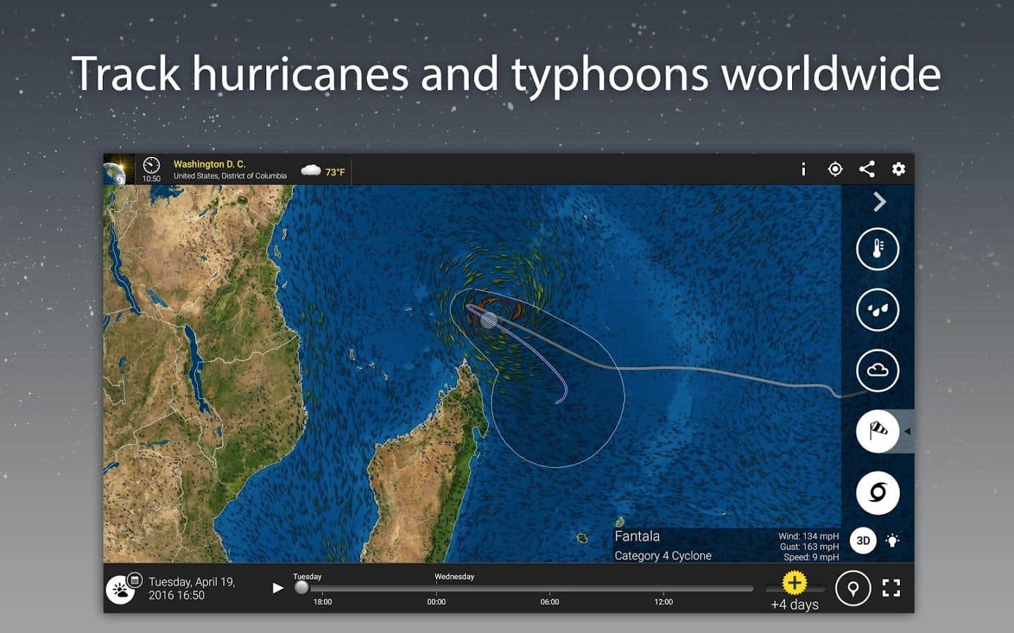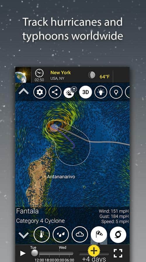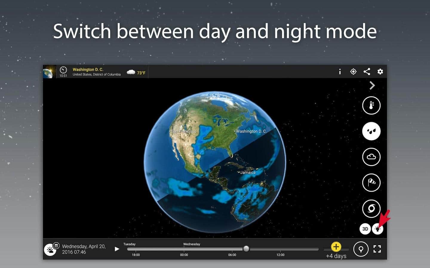MeteoEarth - Відмінне додаток для відстеження змін в погодних умовах. Це погода, яку ви самі можете помацати. Об'єднуючи в собі відмінне тривимірне зображення, і ігрову простоту, ця програма є просто ідеальним для перегляду на погодні зміни. Ви можете обертати земну кулю як вам завгодно, і переглядати погодні зміни на окремих його ділянках.