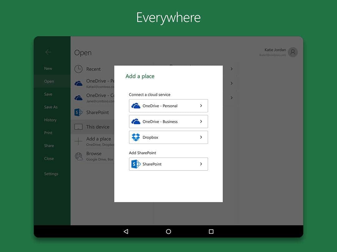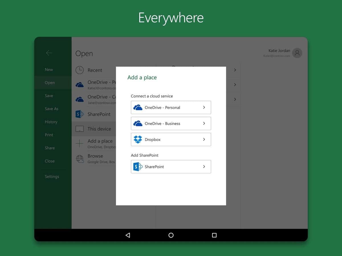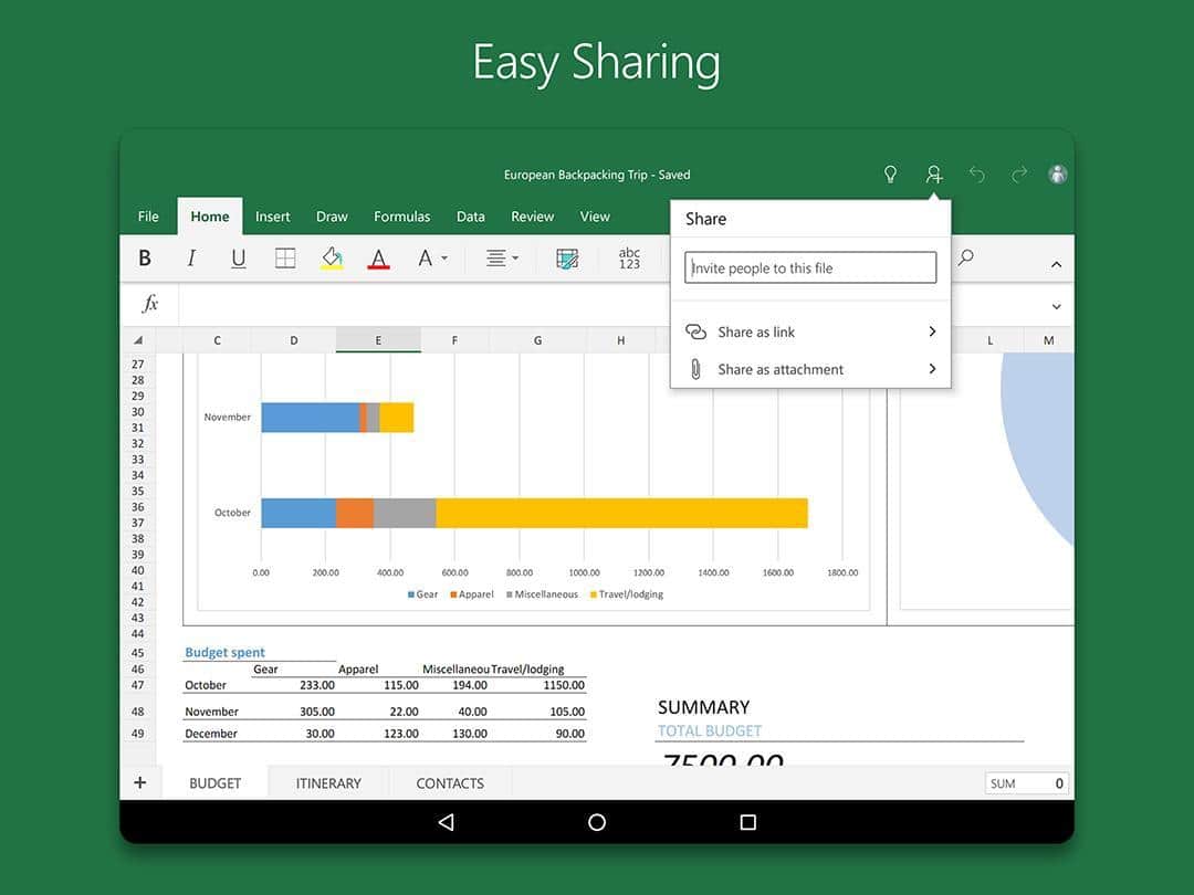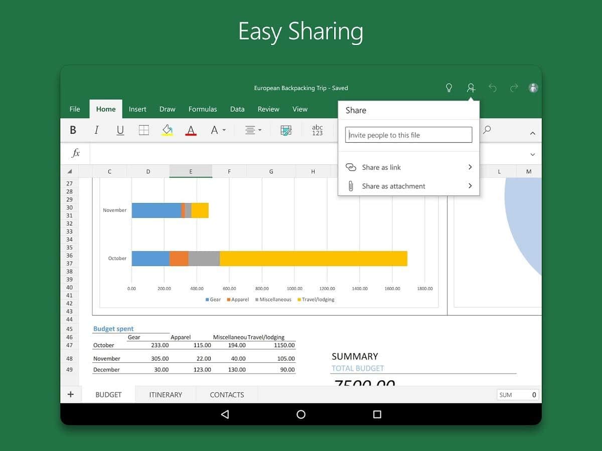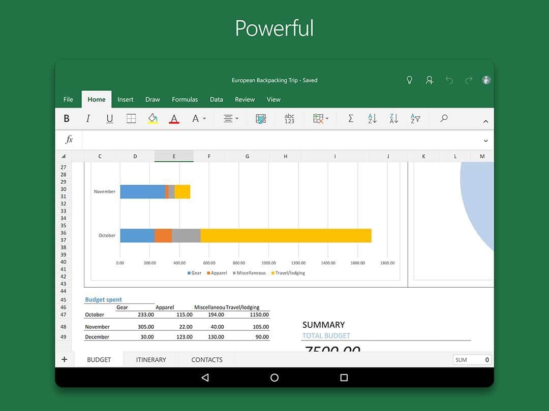 Microsoft Excel - Досить відома програма користувачам на ПК, яка створена для перегляду, створення і редагування електронних таблиць тепер і на андроїд! В додатку реалізовані основні функції перегляду, створення і редагування документів на планшетах з розміром екрана 10,1 дюйма і менше. Можливість складання таблиць, діаграм і звітів, твори самих складних обчислень робить цю програму популярною серед бухгалтерів та економістів. При цьому програма відрізняється зрозумілим інтерфейсом і зручністю використання.