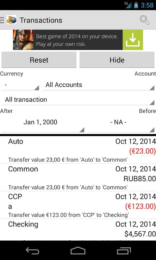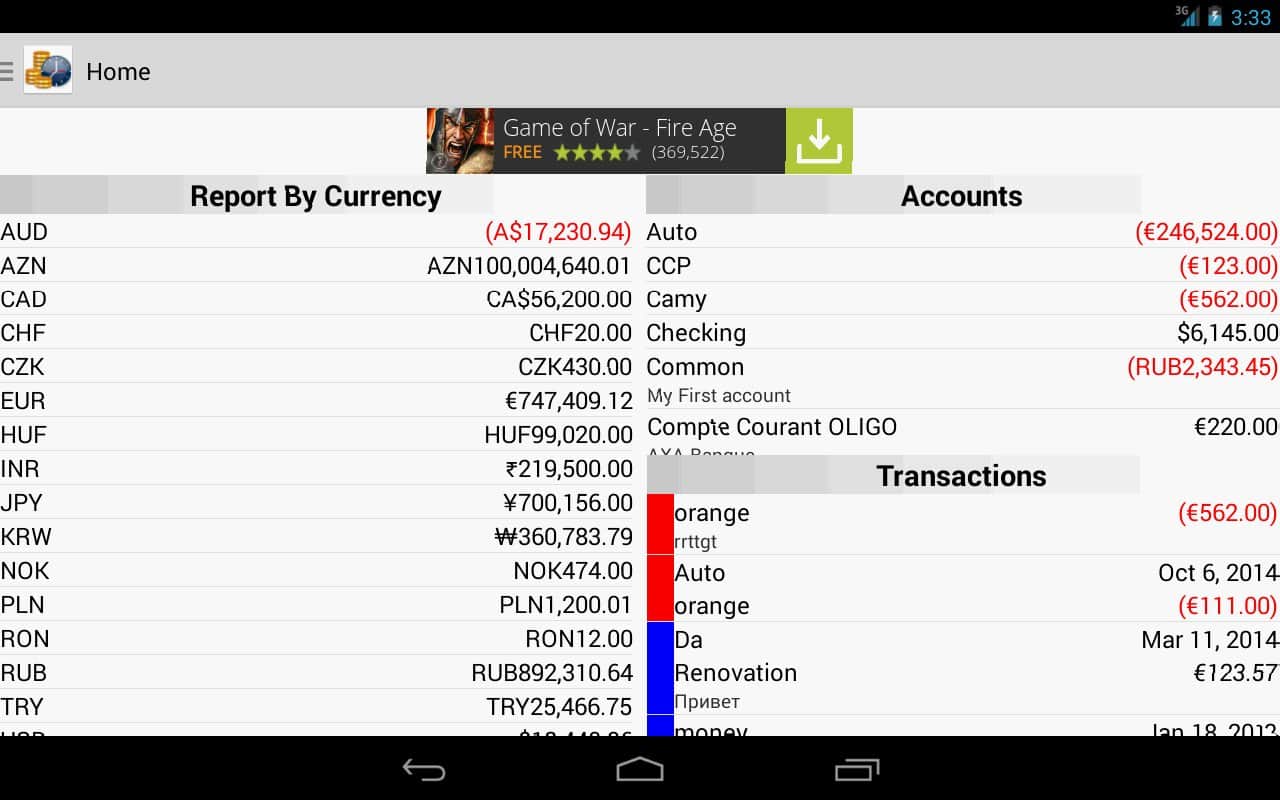 Money2015 - відмінна програма для обліку доходів і витрат. Ваші платежі будуть класифіковані за категоріями, підтримується історія по декількох рахунках і в різних валютах. Платежі за категоріями для зручності виділяються кольором. Підтримка створення різних звітів і діаграм, синхронізації з сервером, переказ коштів з одного рахунку на інший. Дуже зручно і просто.