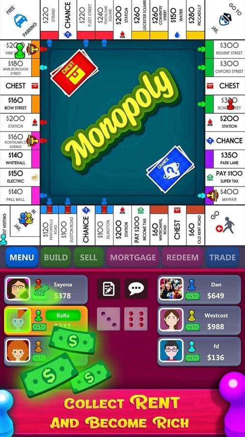 Monopoly – захоплююча настільна гра на андроїд, де ви будете грати в монополію. В цю гру одночасно можуть грати до шести гравців кидаючи кістки і пересуваючи кубики по клітинам. Перевірте на ділі свою удачу і доведіть все що ви кращий монополіст. Зупиняйтеся на вільних клітинках ігрового поля і купуйте там нерухомість. Скуповуйте як можна більше нерухомості і отримуйте як можна більше прибутку. Як тільки суперники будуть зупинятися на клітинах з вашою нерухомістю вони будуть платити вам гроші. Разорите своїх конкурентів і стати найбагатшим гравцем.