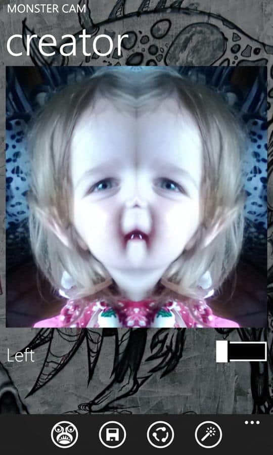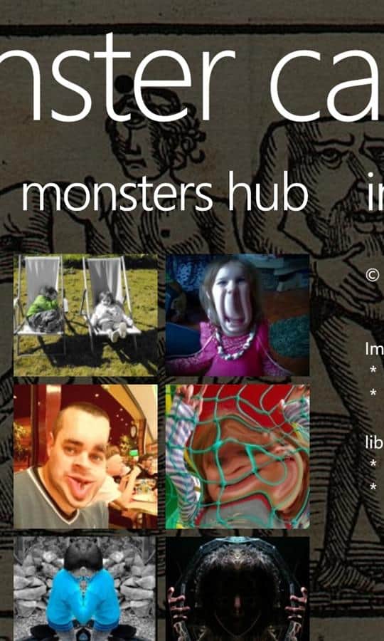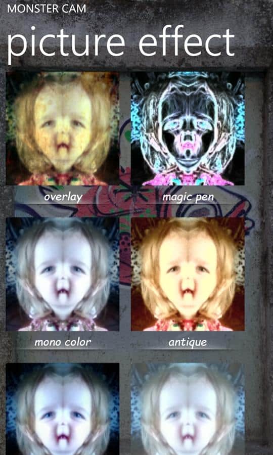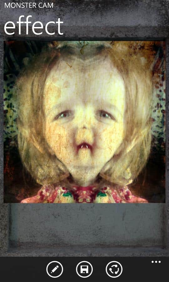 MonsterCam - программа для windows phone, которая поможет превратить все ваши скучные фотографии, в настоящий показ монстров. Трансформируйте ваших друзей, собак, учителей или скучных соседей в настоящих уродов. С помощью этого приложения вы можете изрядно повеселится и поделится своими монстрами в социальных сетях.