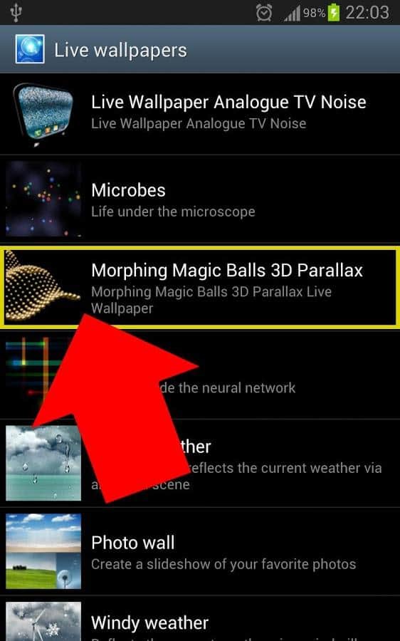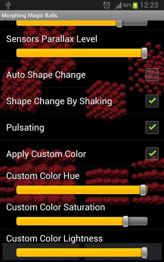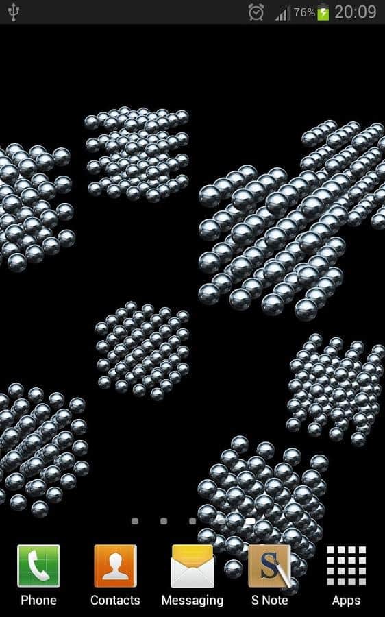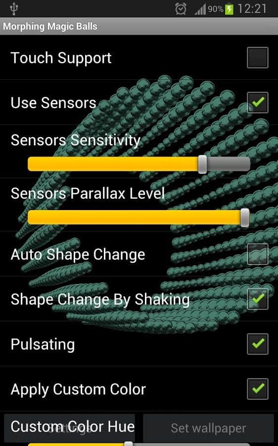 Morphing Magic Balls Parallax - цікаві живі шпалери для андроїд, які імітують металеві кульки. У вашому розпорядженні вибір кольору і зміни форми. В живих шпалерах присутній також автоматичний режим і режим струшування, після якого всі елементи змінюють свою форму – досить цікаве видовище. В живих шпалерах є новомодний в даний час ефект Parallax, з допомогою якого і створюється ефект 3D картинки. Додаток підтримує OpenGL 3D, так що за якість картинки можна не турбується. Шпалери мають маленьку вагу і споживають мало енергії.