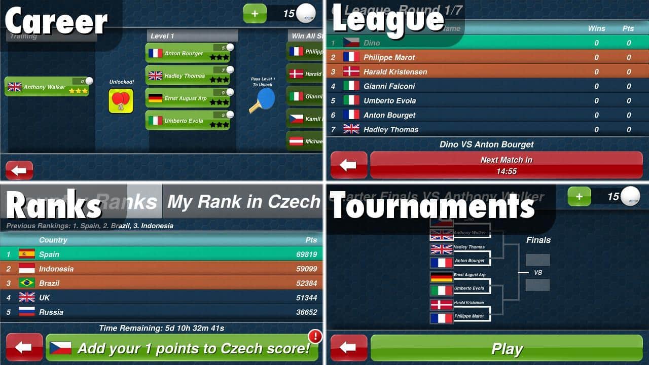 Настольный теннис / table tennis - игра на андроид, с отличной 3D графикой и интуитивно понятным управлением. Запускайте мячик с помощью одного прикосновения к экрану и наслаждайтесь отличной физикой движения. Настройте своего игрока с помощью 20 уникальных обновлений и начните свой карьерный рост, участвуя в различных турнирах. Играйте со своими друзьями и с другими игроками с помощью мультиплеера и занимайте высшие места в таблице лидеров.