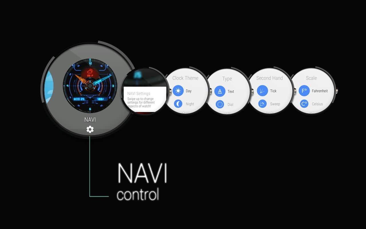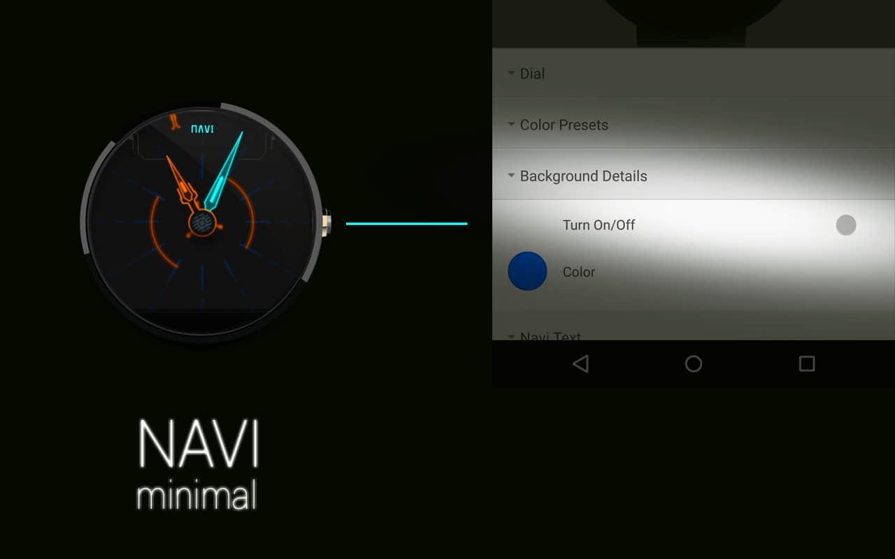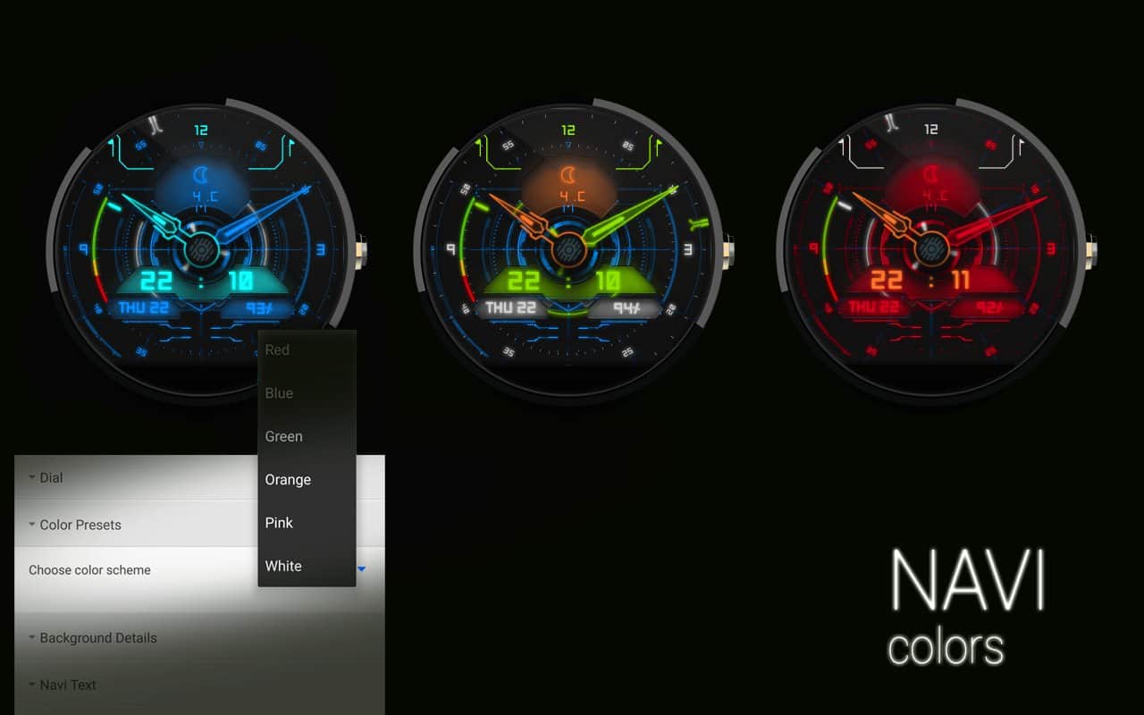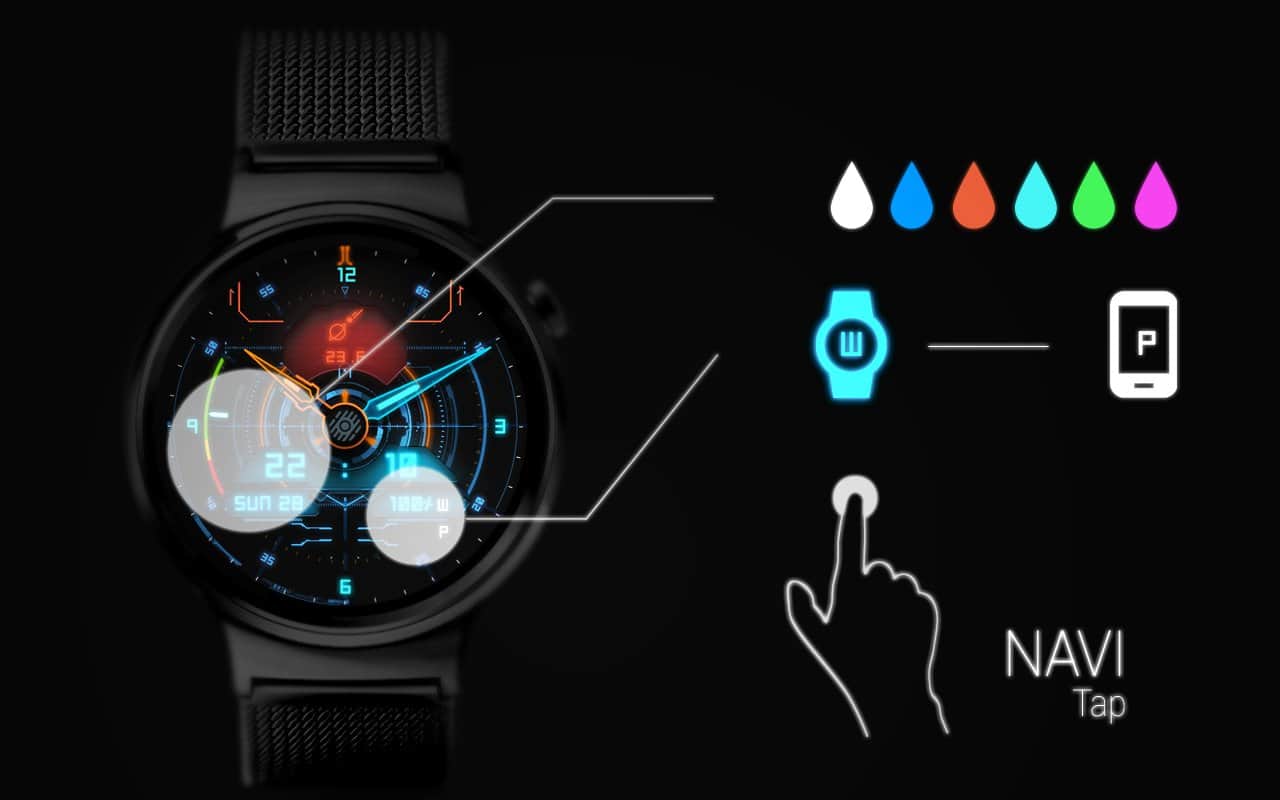 Прекрасний, наповнений дрібними деталями і яскравими квітами циферблат здатний прикрасити будь-які годинники. NAVI це аналоговий вотчфейс з парою стрілок і невеликим індикатором секунд, він дає можливість вибрати одне з декількох запропонованих колірних поєднань, а на екран буде винесена інформація про погоду, рівень заряду батареї, дату та, звичайно ж, поточному часу. Крім того, в програмі безліч гнучких налаштувань.