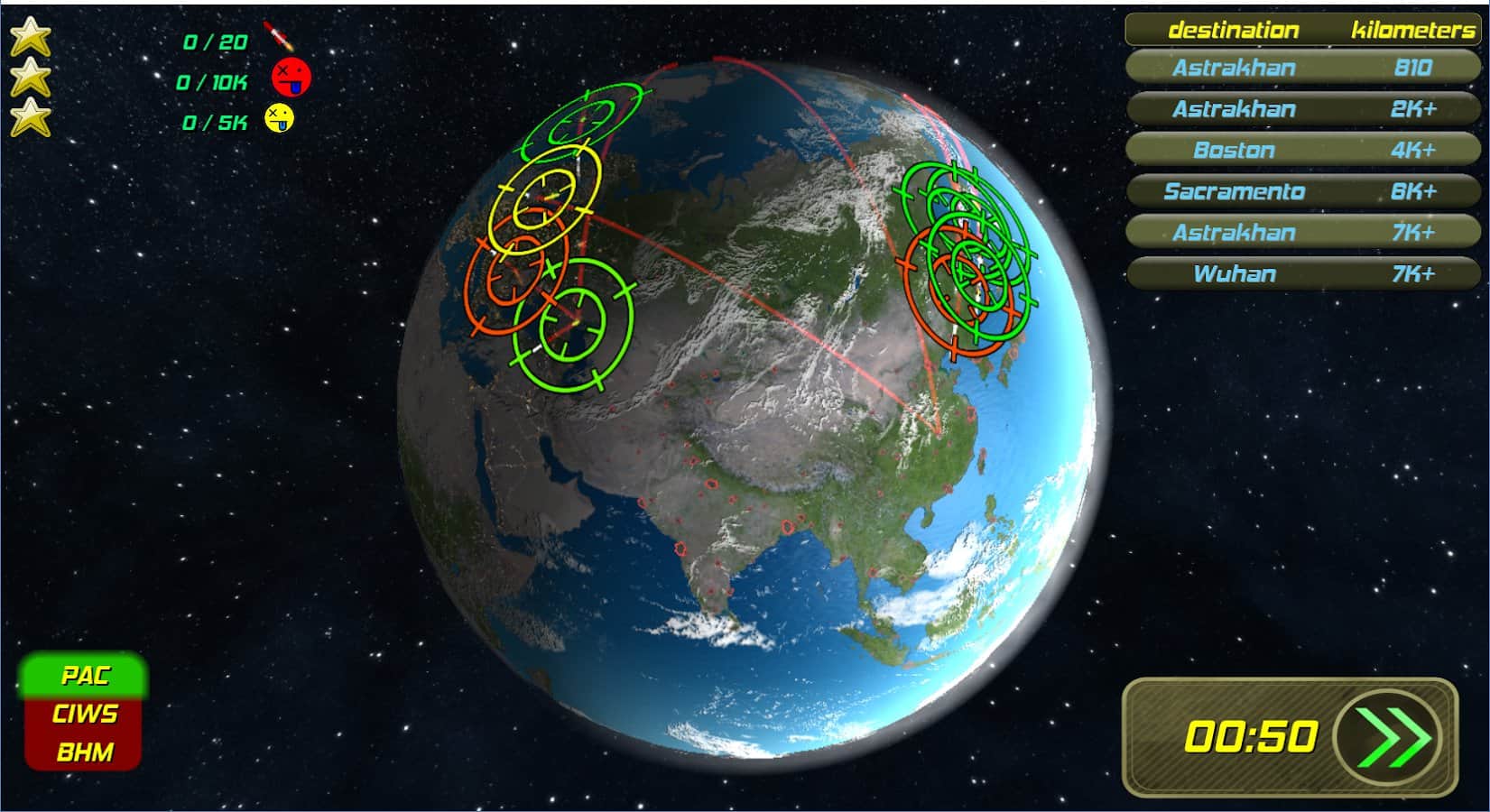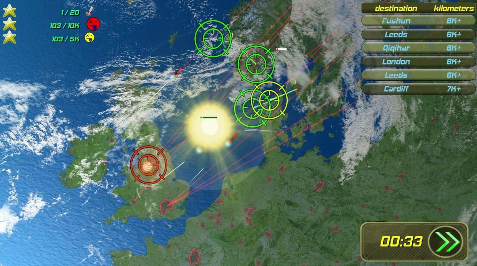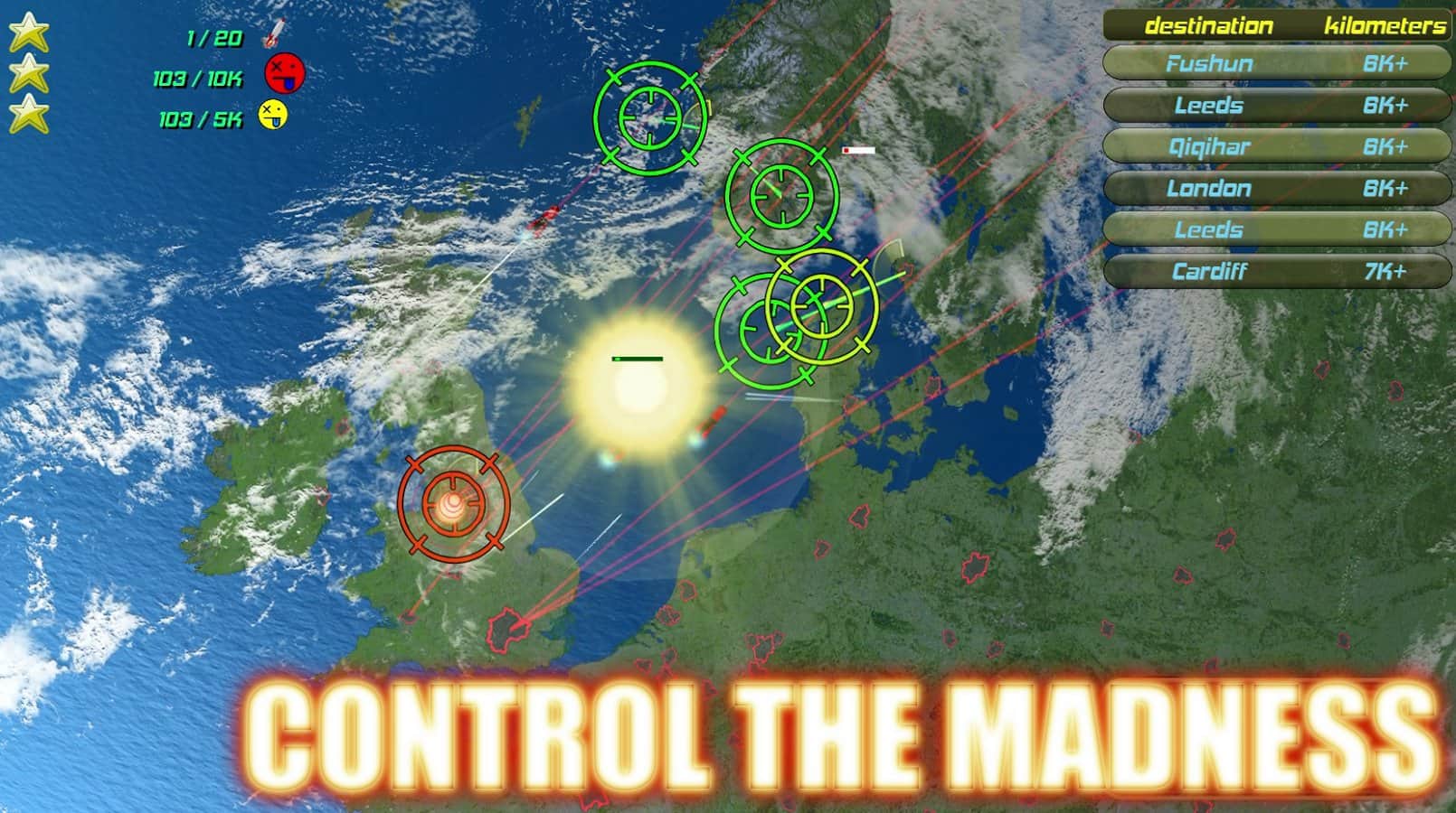 NUKEOUT – захоплюючий симулятор на андроїд, де ви будете запобігати ядерну війну. У цій грі перед вами відкриється величезна карта, на якій живуть мільйон людей і вашим завданням буде захоплювати випущені в вашу сторону ядерні ракети і не дати їм досягти поставленої мети. Зупиніть ядерний Армагеддон і не дайте супротивникам завдати хоч один удар по вашій території. Кидайте виклик гравцям з усього світу і беріть участь в різних турнірах намагаючись досягти неймовірних результатів. Добийтеся перемоги будь-якою ціною, і буде гранично обережні і уважні.