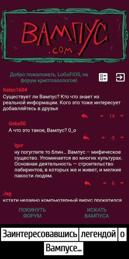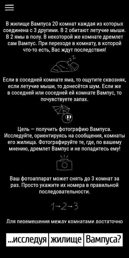 Полювання на Вампуса – текстова головоломка на андроїд, з безліччю загадок і головоломок. У цій грі вашою головною задачею буде проникнути в житло-лабіринт Вампуса і зробити його фотографію. У колі криптозоологів ходить багато легенд про Снігову людину, огнедышащем дракона, Лохнеське чудовисько і звичайно про Вампусе. Один з членом криптозоологического форуму вирішив особисто знайти і проникнути в житло Вампуса і добути його фото будь-яким шляхом. Переміщайтеся по лабіринтах з 20 кімнат і намагайтеся не потрапити в пастку. В будинку Вампуса мешкають миші які будуть переносити вас у випадкові кімнати, а також остерігайтеся ям. Вирішіть всі головоломки і постарайтеся добути хоч одну фотографію.