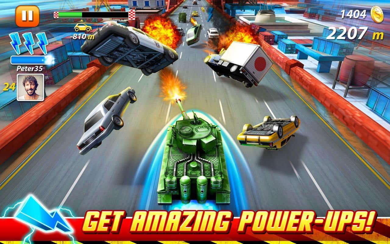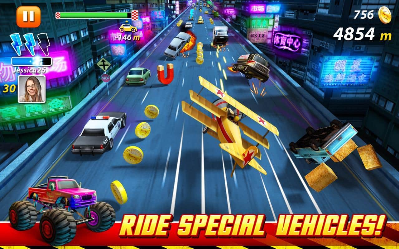 On The Run – сідайте за кермо швидкісного автомобіля і беріть участь в гонці з поліцією. У цій грі ви будете мчати на величезній швидкості по міських вулицях, намагаючись відірватися від переслідує вас поліцейської машини. У грі вас чекає море адреналіну і скажені швидкості, розвинути які ви зможете завдяки різних бонусів і посиленням. Ганяйте по жвавих трасах з нескінченним трафіком і сбирайте по шляху золоті монетки, які допоможуть вам відкрити нові більш потужні автомобілі. Керуйте різними транспортними засобами і здійснюйте запаморочливі трюки та стрибки, а також вдавайтеся до допомоги військової техніки танках і літаках і зовсім незвичайним НЛО.