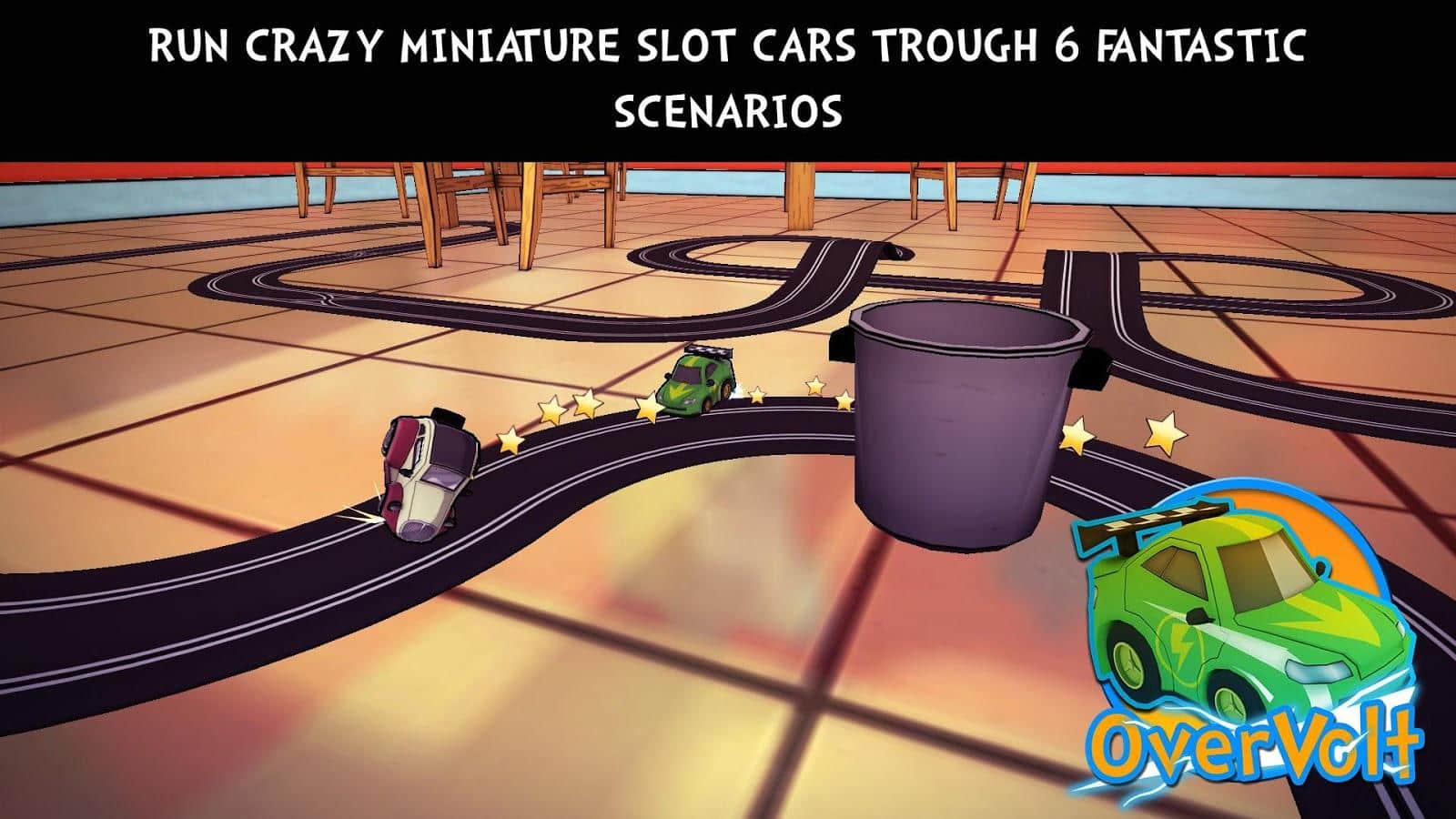 OverVolt: crazy slot cars - цікаві і захоплюючі гонки на андроїд, з божевільними поворотами і запаморочливими трюками. Вибирайте собі іграшковий автомобіль, будь-якого виду і змагайтеся зі своїми друзями, ганяючи по різноманітних трасах, яких в грі більше 40. Станьте кращим гонщиком в цій грі. Вибирайте один з двох доступних режимів одиночний або багатокористувацький і застосовуйте додаткові бонуси і прискорення.