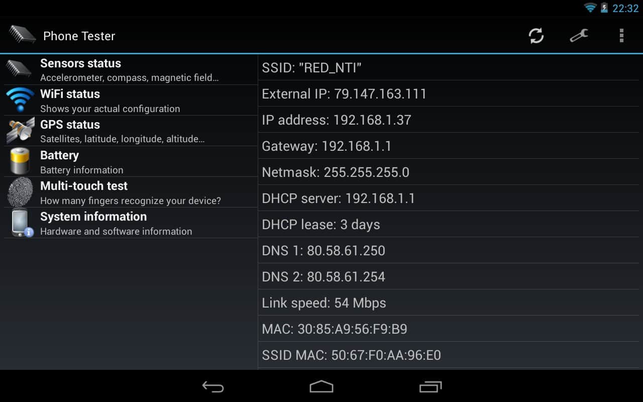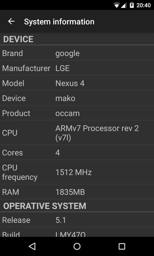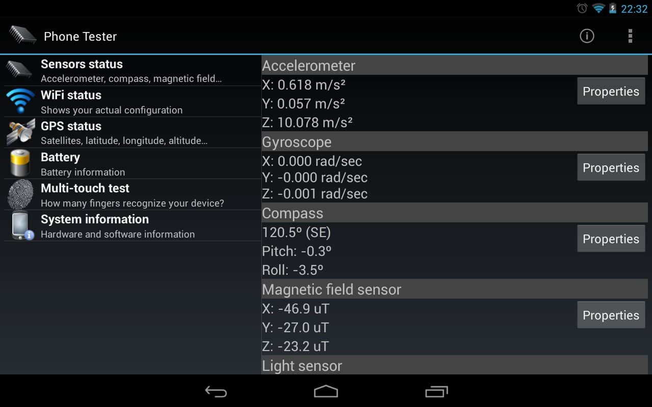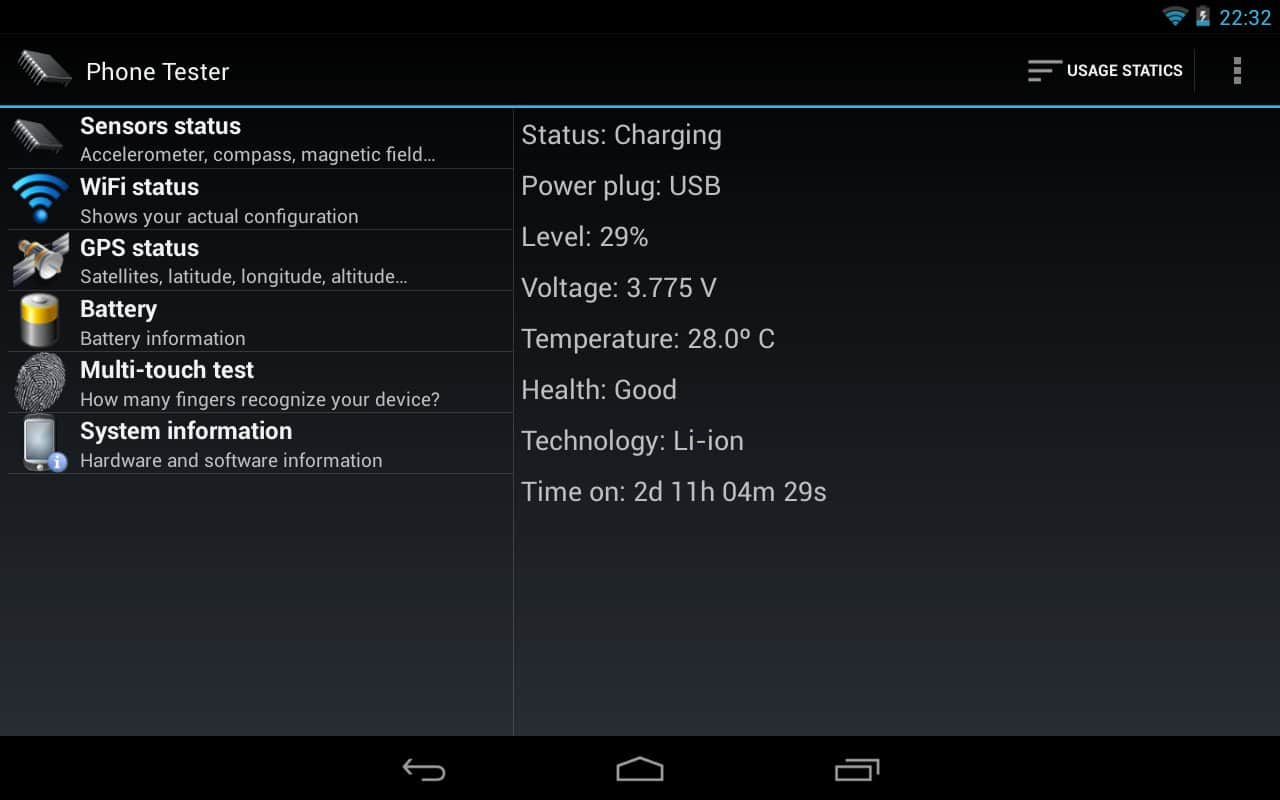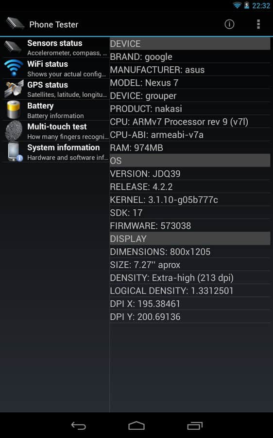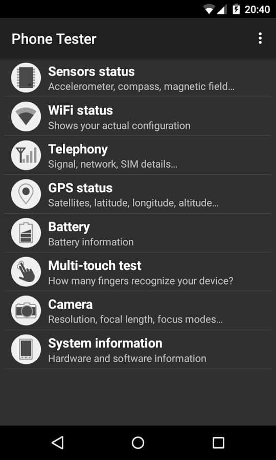 Phone Tester (hardware info) - Чудовий додаток, яке збере безліч різної інформації про вашому смартфоні, з його допомогою ви зможете дізнатися все, що вам необхідно. Інформація про апаратне і програмне забезпечення, як CPU, RAM, ядро, екран і безлічі інших елементів вашого смартфона.