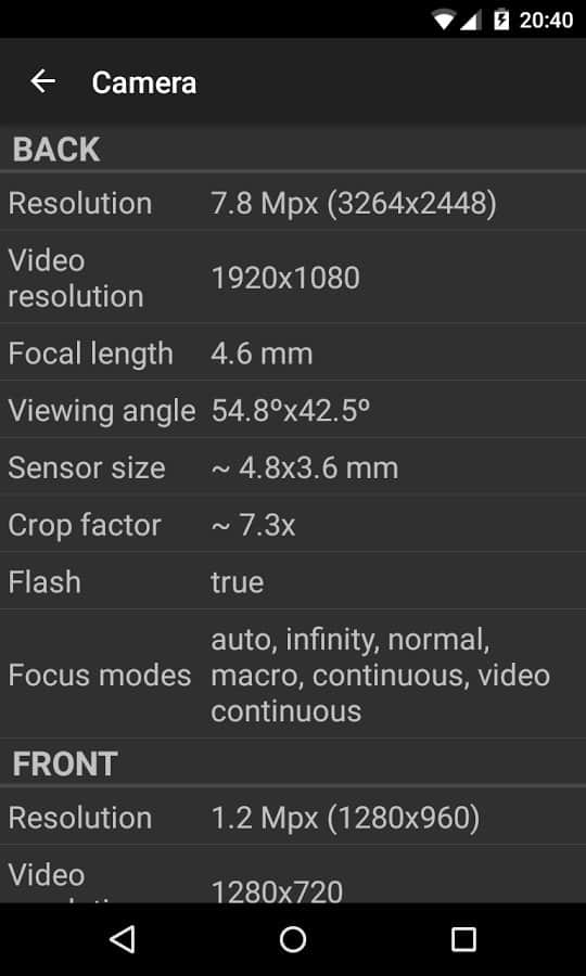 Інформація про камеру вашого пристрою, такі як дозвіл, фокусна відстань, кроп-фактор по відношенню до 35-міліметровій плівці, режими фокусування, розмір матриці