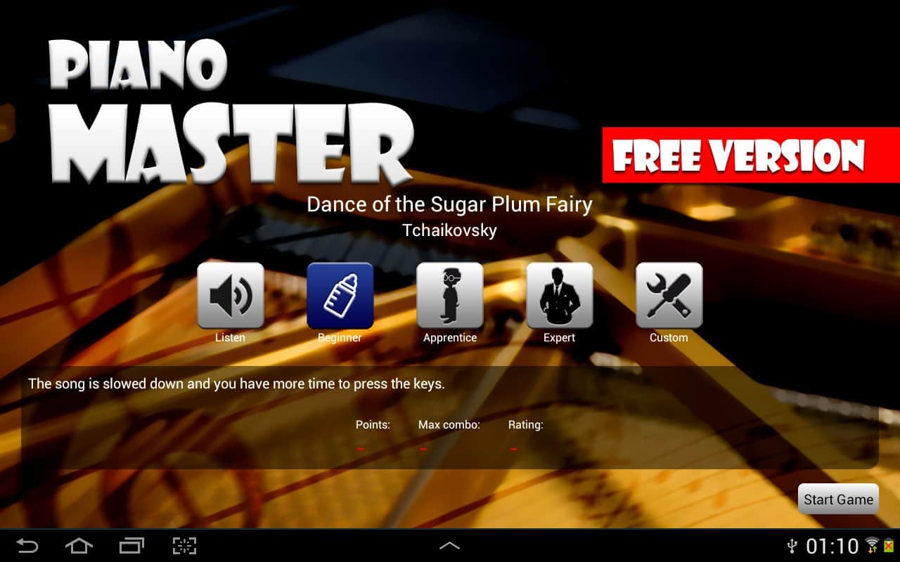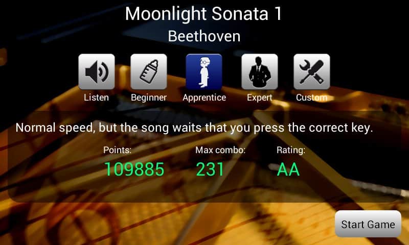 Piano Master – отличная возможность обучится игре на фортепиано на своем андроид смартфоне или планшете. Обучение приходит весьма весело, есть возможность выбора сложности, так что отлично подойдет как детям так и взрослым. Piano Master включает в себя произведения классических авторов музыки, таких как Шопен, Бах, Бетховен. А так же большое количество популярных мелодий.