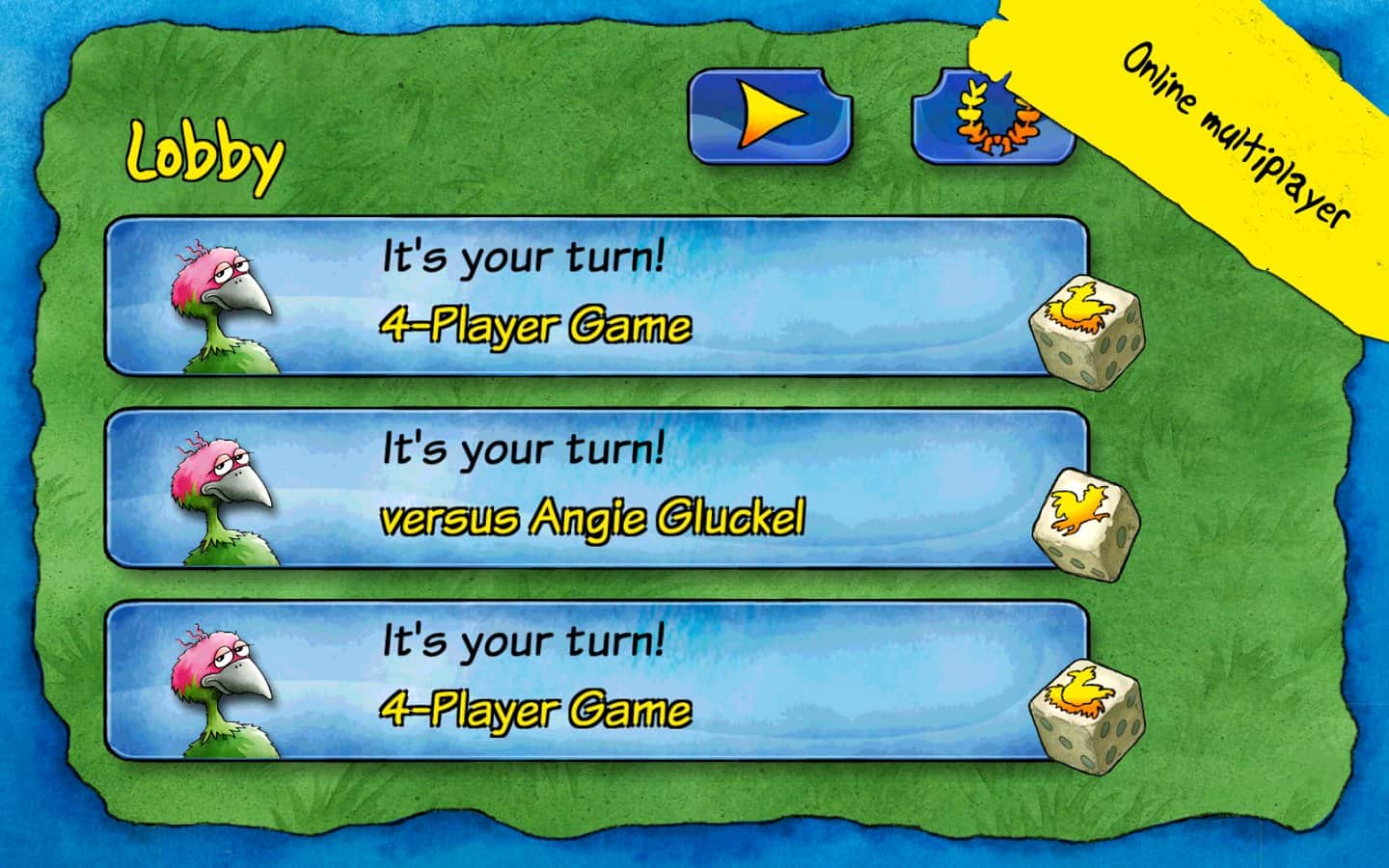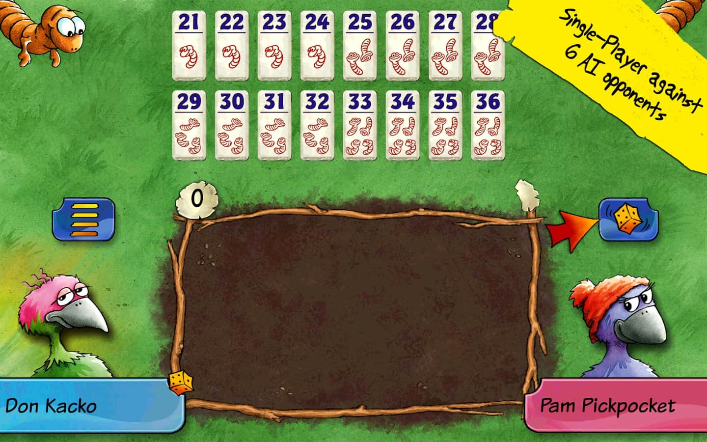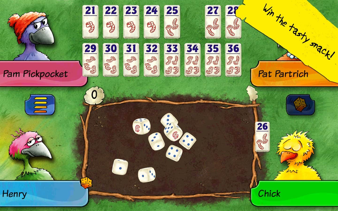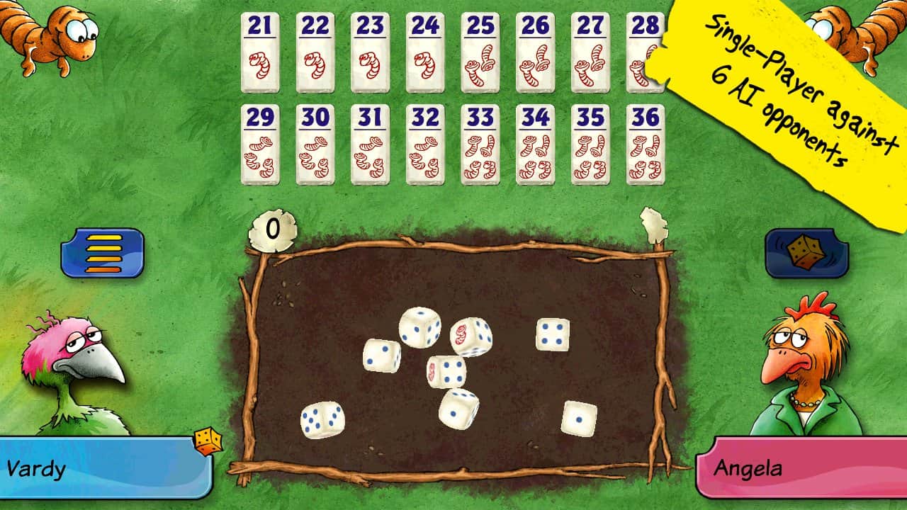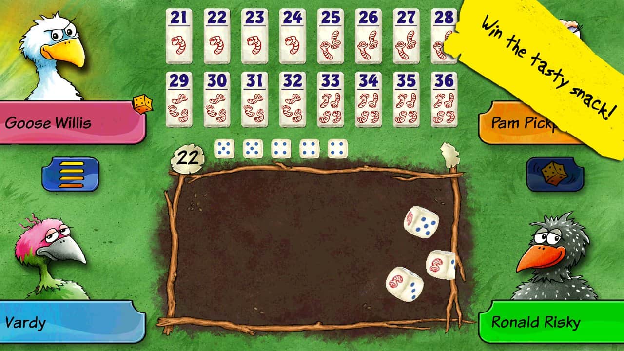 Pickomino by Reiner Knizia - Черв'яки, приготовані на барбекю користуються великим попитом, і тільки спритна курка може виграти смачні закуски. Але ви завжди повинні бути напоготові, адже сама повільна курка, яка не встигає схопити черв'яка з гриля з легкістю може взяти і вас з тарілки! Грайте з друзями великою компанією, один проти одного або ж просто проти девайса.