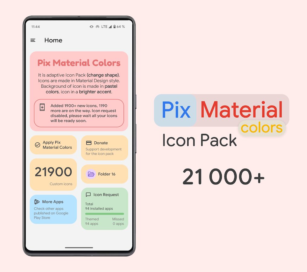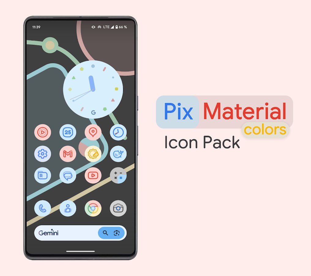 Перетворіть свій смартфон з Pix Material Colors — адаптивним пакетом іконок у стилі Material Design. Понад 21 000 мінімалістичних іконок, м'які пастельні фони та яскраві акценти надають інтерфейсу свіжості та гармонії. Підтримка тематичних віджетів годинника робить екран не тільки стильним, але й функціональним. Налаштуйте свій Android під себе — витончений дизайн в кожному пікселі чекає на вас просто зараз!