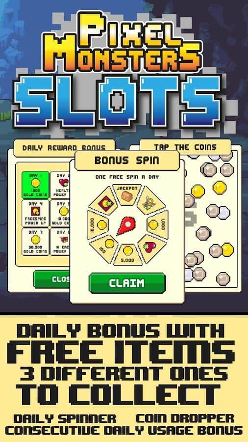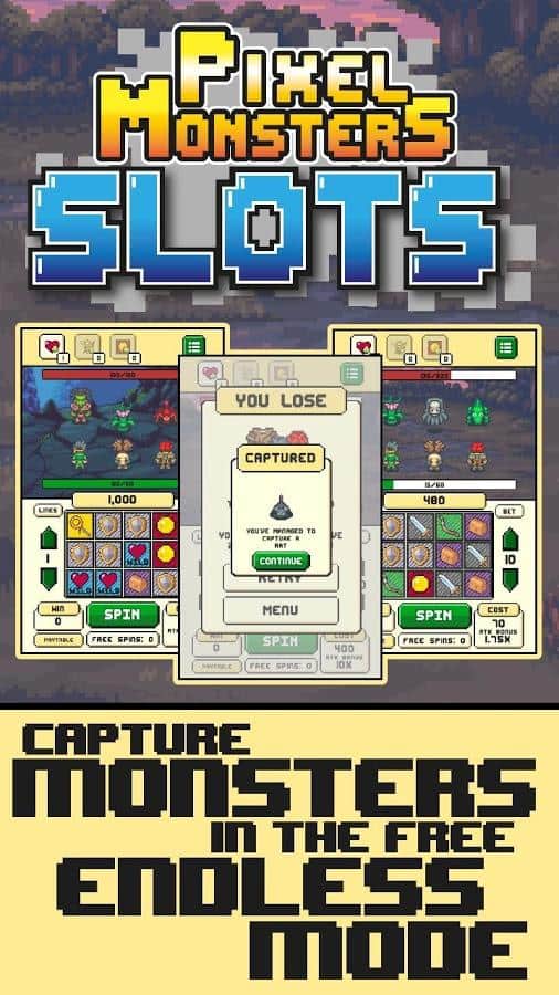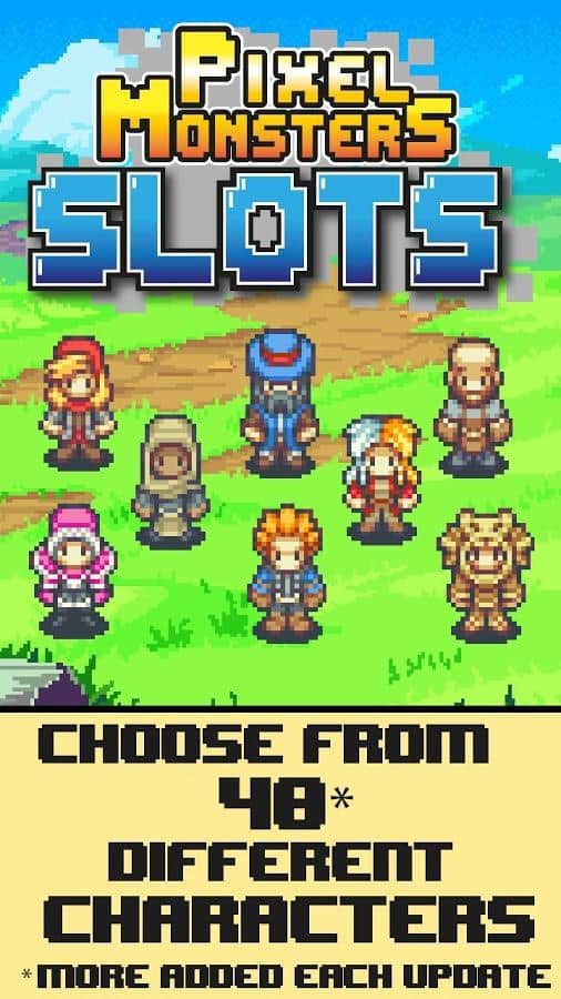 Pixel Monsters: Slots – RPG на андроїд, де ви будете допомагати команді з трьох героїв подорожувати по небезпечному світі цієї гри. Ведіть своїх героїв вперед і вступайте в бій з численними ворогами і сильними супротивниками. Атакуйте ворогів з допомогою випадання різних предметів або захищайтеся від натиску монстрів. У цій грі ви спробувати свою удачу і подивіться, чи зможете ви перемогти всіх ворогів шляхом випадання тих чи інших слотів з атаками або захистом. Перемагайте встали на вашому шляху ворогів і збирати цінну здобич після перемоги, а також поповнюйте свою колекцію героїв новими персонажами. Отримуйте численні посилення і перемагайте швидше за своїх ворогів.