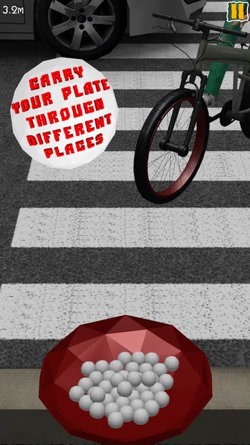 Plate – захоплююча аркада на android, дії якої будуть відбуватися від першої особи. У цій грі вашою головною задачею буде пронести як можна далі тарілку з численними об'єктами в ній і не втратити їх по дорозі. Перевірте на ділі свою відмінну реакцію і спритність, несучи тарілку і оминаючи численні перешкоди у себе на шляху. Заробляйте зірки за пройдені рівні і відкривайте для себе нові. Кожен новий рівень у цій грі має своїм секретом, розгадати його і відкривайте нові рівні. Попереду вас чекає багато локацій, нові тарілки і перешкоди.