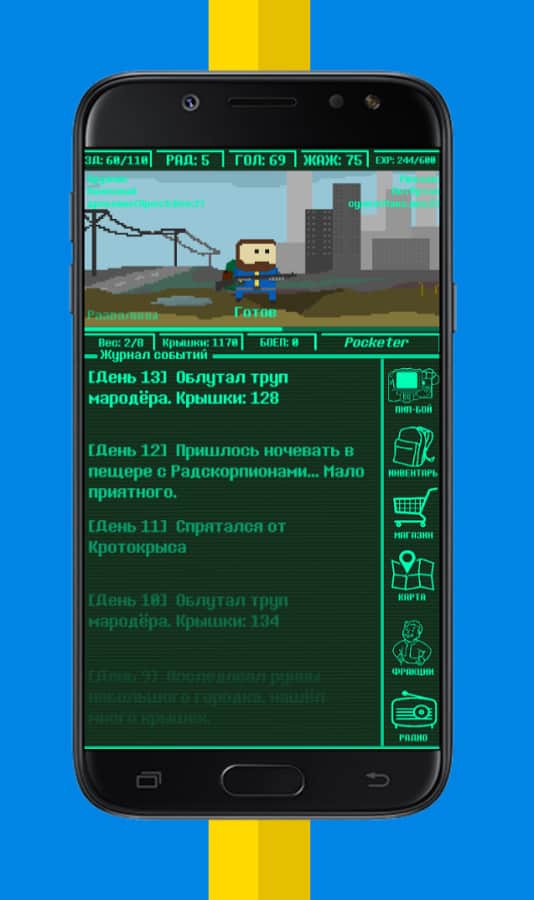 Pocket Fallout – захоплююча гра на андроїд, де ви будете виживати в жахливому зруйнованому світі. У цій грі ваш герой буде переміщатися, і досліджувати світ навколо себе, а ви будете стежити за всім, що відбувається на сторінках «журналу подій». Прокачуйте свого героя по ходу гри і наделяйте його потужною зброєю для боротьби з ворогами або непомітною екіпіровкою. Розробіть свою тактику ведення гри і допоможіть відмінних результатів. Приєднуйтесь до однієї з фракцій мешкають в цьому світі і отримуйте довгоочікувані бонуси. Скуповуйте і збирайте розхідники і продавайте їх набагато дорожче і вигідніше для вас. Слухайте радіо і протримаєтеся якомога довше в цій грі.