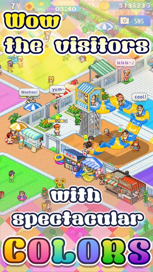 Pool Slide Story – симулятор на андроїд, де ви будете будувати свій аквапарк. У цій грі ви опинитеся в тропічний рай, де вашим завданням буде побудувати величезний аквапарк з численними гірками і різноманітними басейнами. Розміщуйте на території аквапарку численні кіоски з продуктами харчування і напоями, а також роздавайте надувні круги і купальники. У цій грі ви знайдете величезну кількість різних налаштувань і предметів, які допоможуть вам створити свій аквапарк мрії. Створіть чудовий аквапарк і запрошуйте в нього нових відвідувачів.