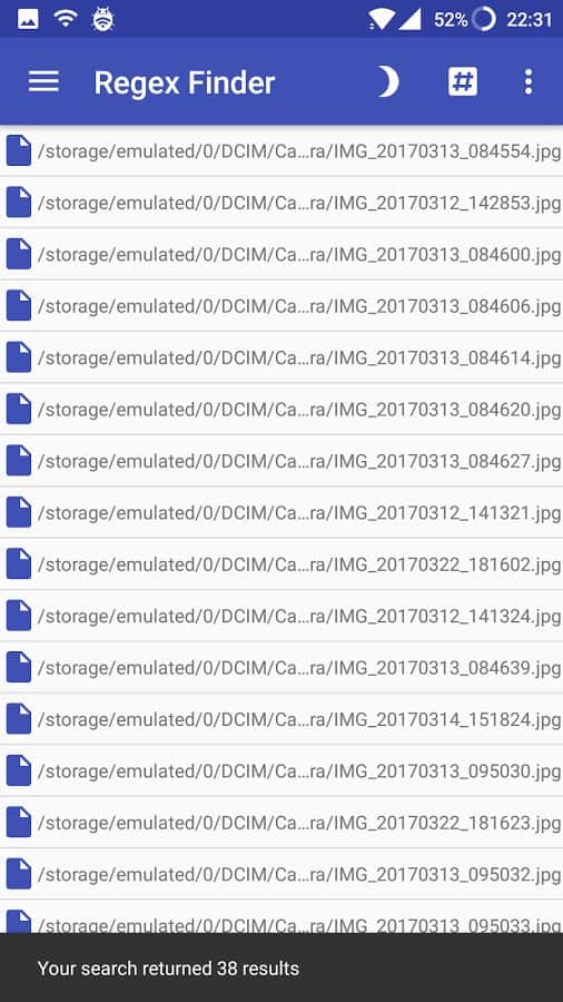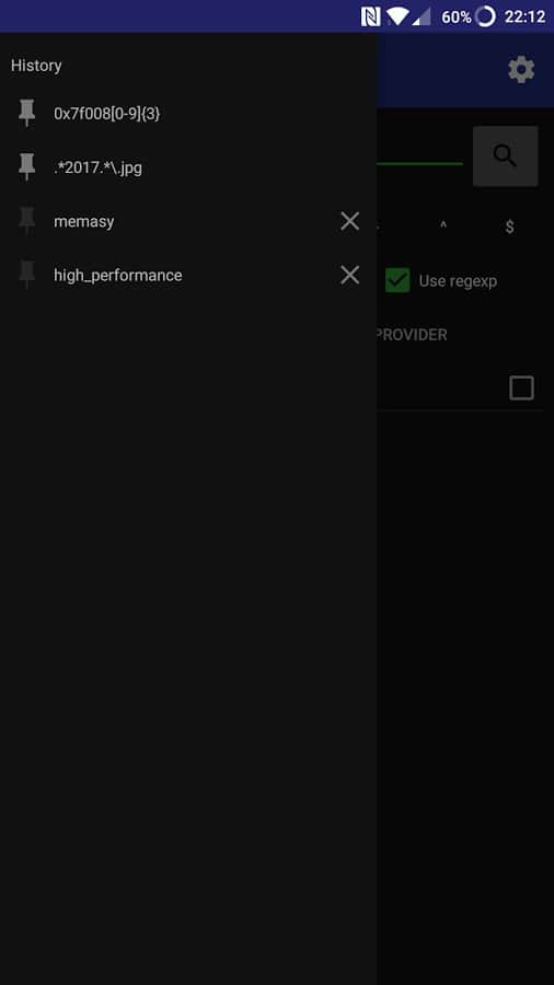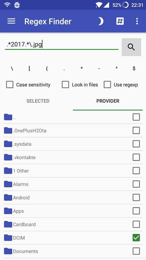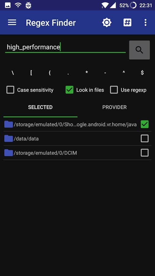 Regex Finder - Досить цікавий додаток яке з легкістю замінить вам стандартні файлові менеджери. Відрізняється він від інших тим, що проводить пошук не тільки за назву документа або папки, але і за виразами, це означає, що будь-який ваш документ може бути знайдений. При всій своїй функціональності ця програма не вимагає додаткових прав.