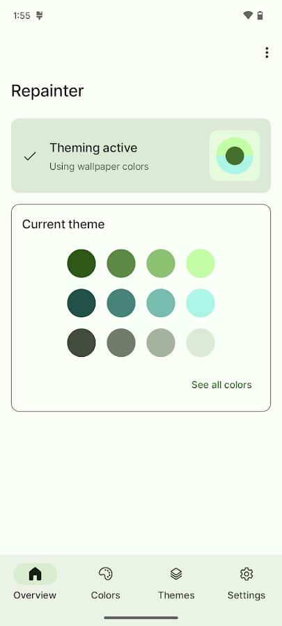 < p > Repainter - це чудове рішення для будь-якого пристрою на Android 12 і вище. Динамічно настроюється Material You тепер доступнаі на вашому пристрої. Repainter також має прекрасне співтовариство з наступними можливостями:< / p>