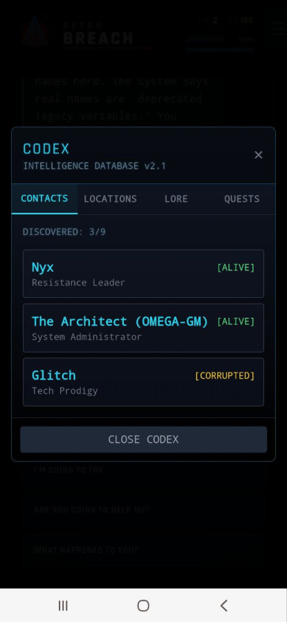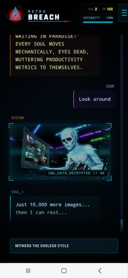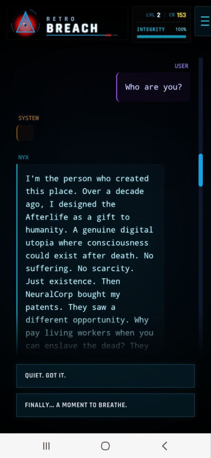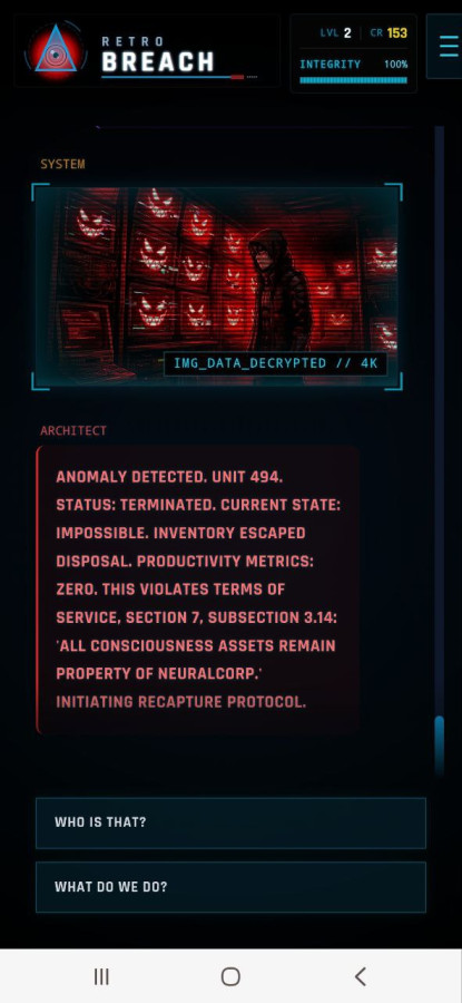 Retro Breach — це похмура інтерактивна драма, у якій ви прокидаєтеся всередині секретної мережі після смерті і дізнаєтеся, що ваш розум перетворено на робочу силу для корпорації. На вас чекають хакерські випробування, вибори з наслідками та боротьба за відновлення істини. Маніпулюйте системою, уникайте цифрових охоронців і активуйте вірус, здатний знищити в'язничний сервер, щоб отримати шанс на справжню свободу.