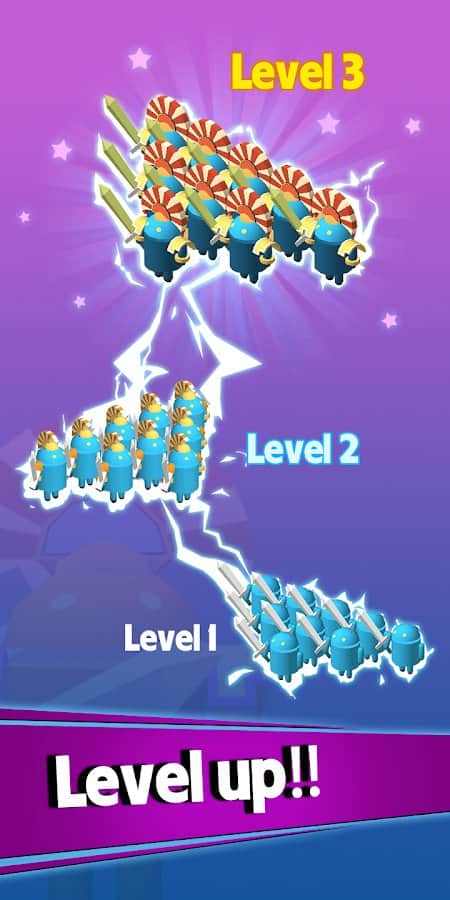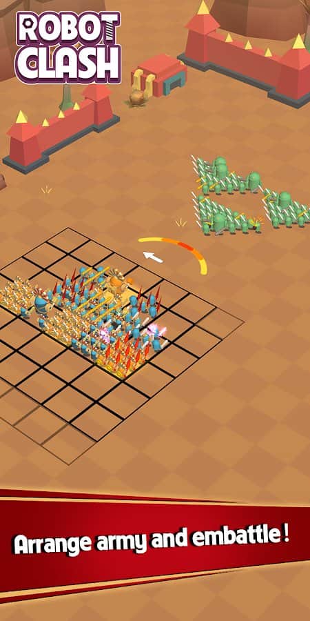 Robot Clash – казуальна гра, де ви будете битися в бою стінка на стінку. У цій грі вашою головною задачею буде розробити свою незламну тактику ведення бою враховуючи при цьому фігуру з бійців і ідеальне напрямок. Створіть свою непереможну армію роботів і модернізуйте її щоб отримати більше сили, яка знадобиться вам у битві. Бої в цій грі будуть проходити блискавично і автоматично і головне, що від вас буде вимагатися це торкатися екрану свого телефону або планшета в потрібний момент. Виходьте переможцем з усіх битв і встановлюйте свої рекорди в цій грі.