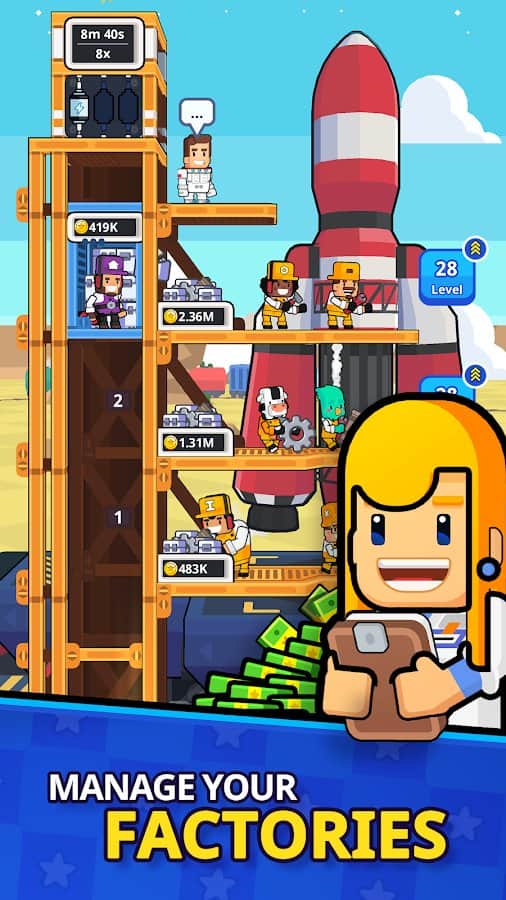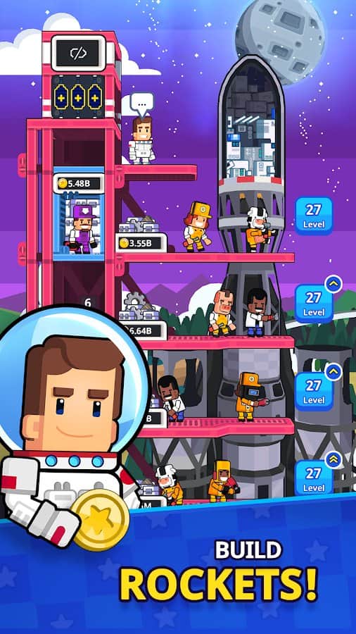 Rocket Star - Idle Space Factory Tycoon Games – захоплююча економічна стратегія для андроїд, де ви будете керувати ракетостроительным підприємством. У цій грі ви будете керувати величезним заводом і створювати ракети різної конфігурації. Створюйте з кожним разом все більш складні ракети і заробляйте гроші, а також запускати в космос різні предмети. Прискорюйте виробництво ракет і запускайте реактивні двигуни що дозволить вам колонізувати інші планети. Виконуйте всі поставлені місії гри і стати найбагатшою людиною на планеті висаджуючи своїх космонавтів на Місяць, Марс, Юпітер та інші планети.