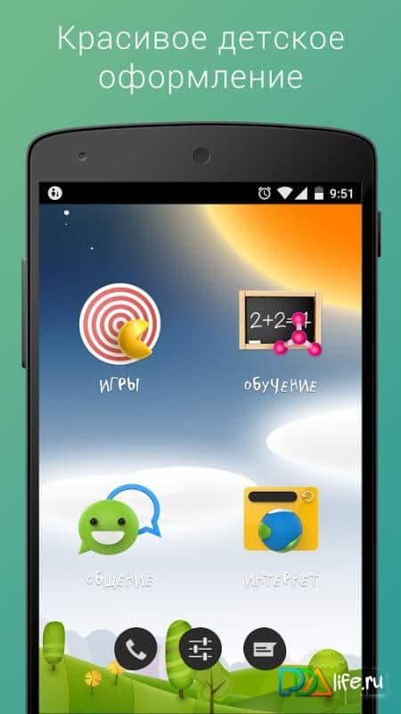 Перед вами — якраз такий варіант. Оболонка має приємне просте оформлення. яке сподобається дитині і опції, які сподобаються його батькам: заборона відправки викликів і повідомлень, обмеження часу використання смартфона (планшета) або певних програм а також блокування частини програм і всіх покупок.