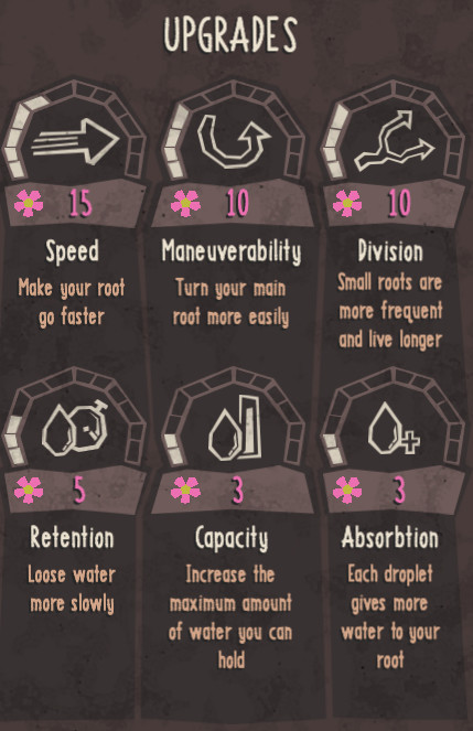 ROOTS — це медитативна гра, в якій ви керуєте насінням, що пускає коріння в пошуках води. Уникайте небезпек, досліджуйте підземні глибини, покращуйте свої коріння та відкривайте приховані таємниці під землею.