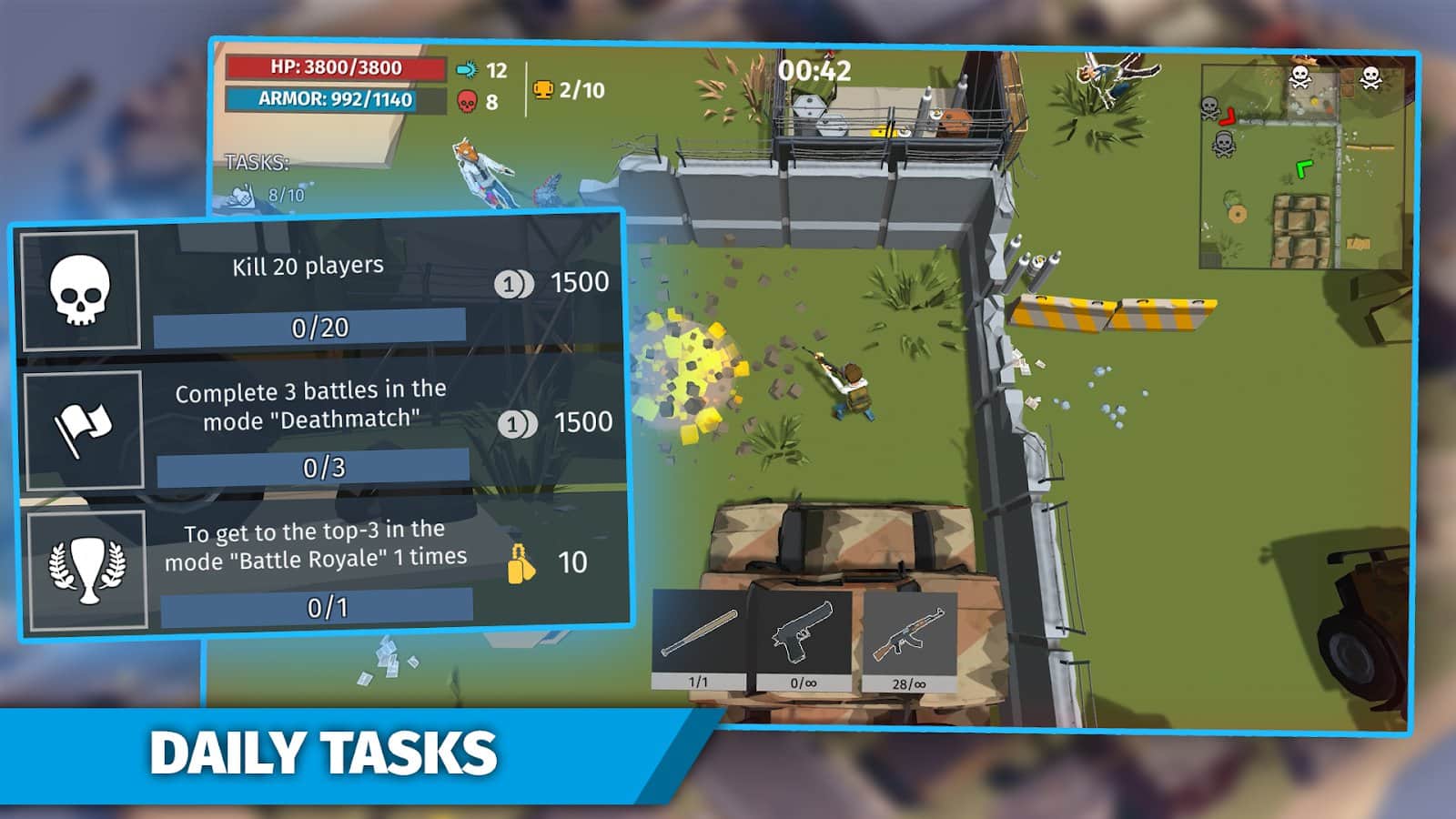 Royale Battleground - battle royale game – динамічний онлайн шутер на андроїд, в популярному жанрі Battle Royale. У цій грі ви высадитесь на безлюдному острові і постаратися знищити всіх суперників швидше, ніж вони дістануться до вас. Виживайте будь-якою ціною і досліджуйте острів шукаючи зброю і боєприпаси. Переміщайтеся по величезних картах і змагайтеся один з одним в рейтингових боях. У грі ви знайдете два режими гри, де ви зможете грати разом з друзами, а також самому без інтернету. Запрошуйте в гру друзів, скоряйте острів і виживайте, піднімаючись все вище в таблиці лідерів.