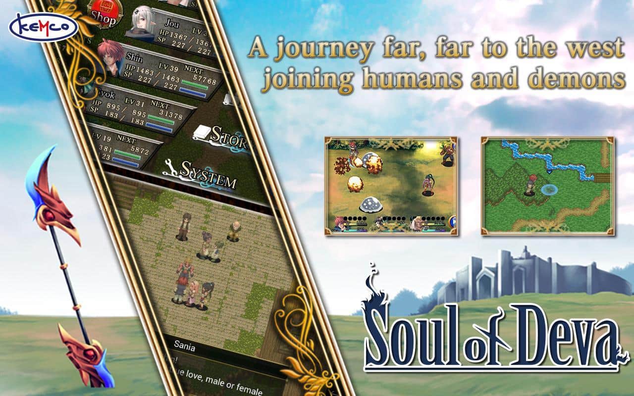 RPG Soul of Deva - RPG на аndroid, в якій ви потрапите в світ де демони нападають на людей, а люди живуть в постійному страху перед ними. Дівчина на ім'я Санія відома як "спаситель" зголосилася допомогти людям в їх боротьбі проти демонів, і коли її життя весела на волосині їй допоміг молодий демон Шин. Вони разом вирушили в небезпечну подорож, яка дозволить їм пробудити таємничі сили, що ховаються в дівчині. Боріться зі злими демонами за допомогою своєї зброї і збільшуйте його силу і міць.