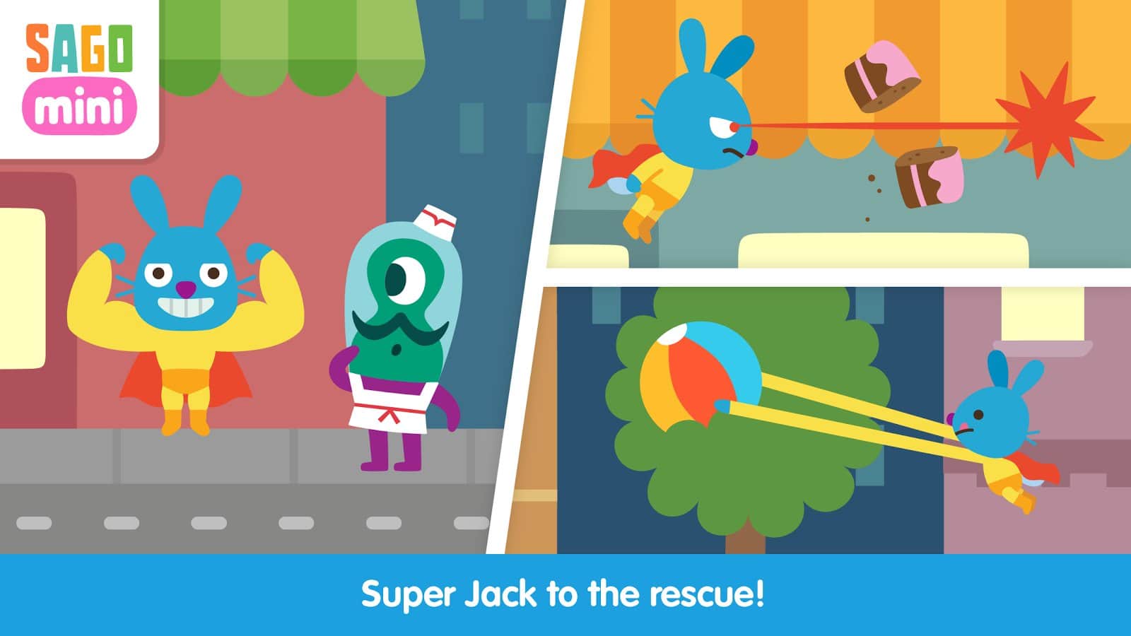 Sago Mini Superhero – цікава гра на андроїд, створена для дітей, де вони будуть допомагати зайчику Джеку стати супер героєм. Управляйте головним персонажем за допомогою одного дотику пальця і взымайте в повітря намагаючись допомогти всім жителям міста і прийти на допомогу потрапили в біду. Літайте, з легкістю пересувайте величезні тяжкості і подзаряжайтесь морквинами, наводячи порядок в місті. Ця дуже захоплююча гра, де кожна дитина зможе стати супер героєм і рятувати жителів невеликого мультяшного містечка.