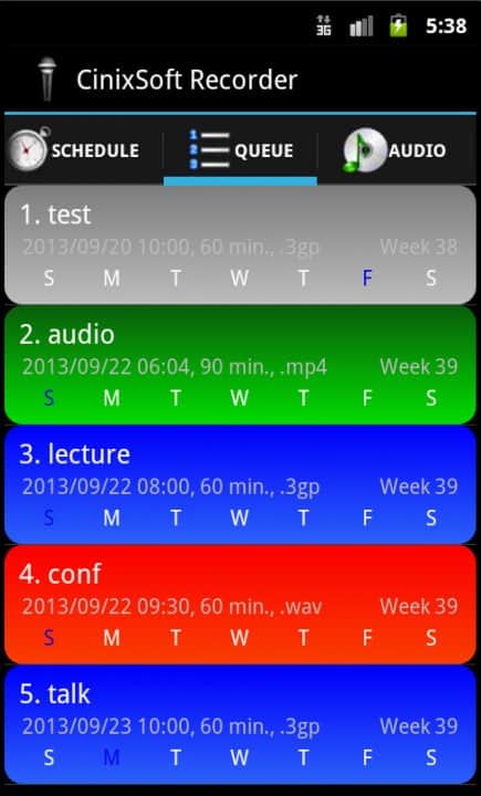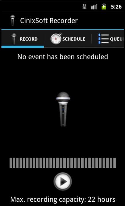 Schedule Voice Recorder - диктофон, который может включаться по заранее заданному времени. Есть возможность составить расписание на несколько дней вперёд или включить цикличность записи (ежедневно, еженедельно, ежемесячно). Приложение можно использовать для записи встреч, лекций, уроков, модно делать свои звуковые заметки и примечания и всё это без ограничений по времени.Выбор Аудио форматов: MP4, 3GP или WAV как аудио-формат. По сравнению с WAV, MP4 и 3gp позволит записывать намного дольше. Записями легко поделиться через социальную сеть Facebook, электронной почте или другими способами.