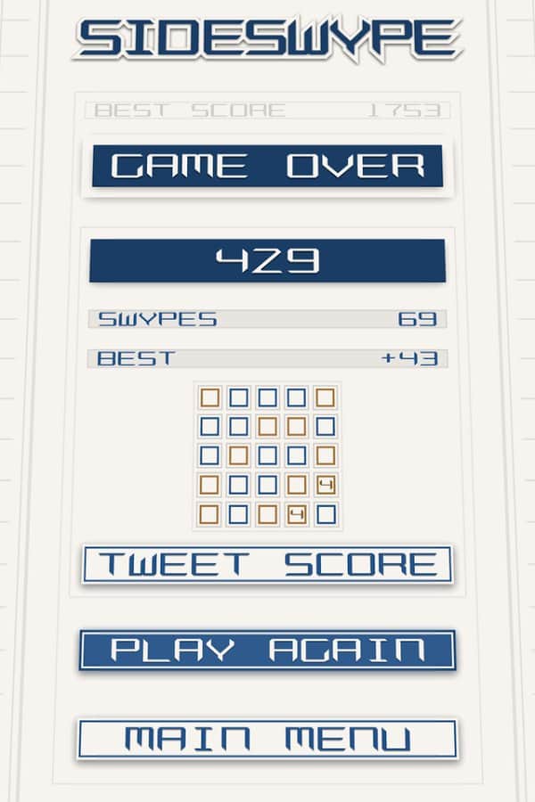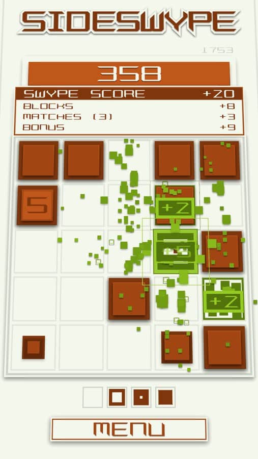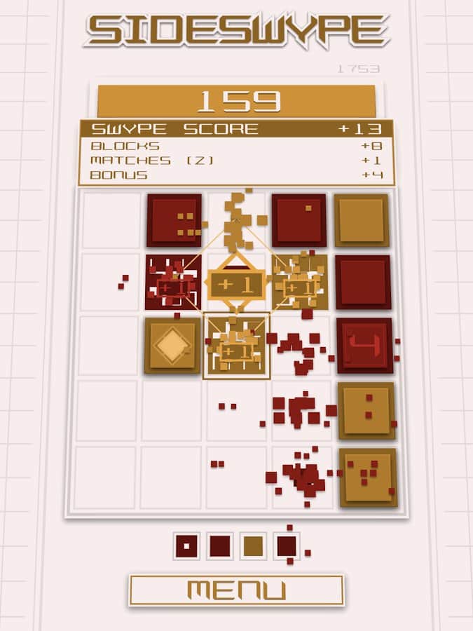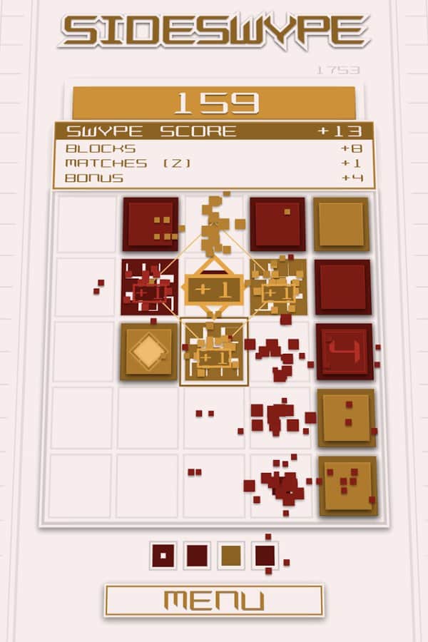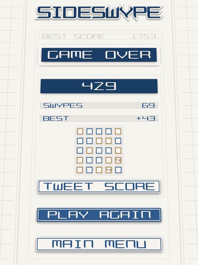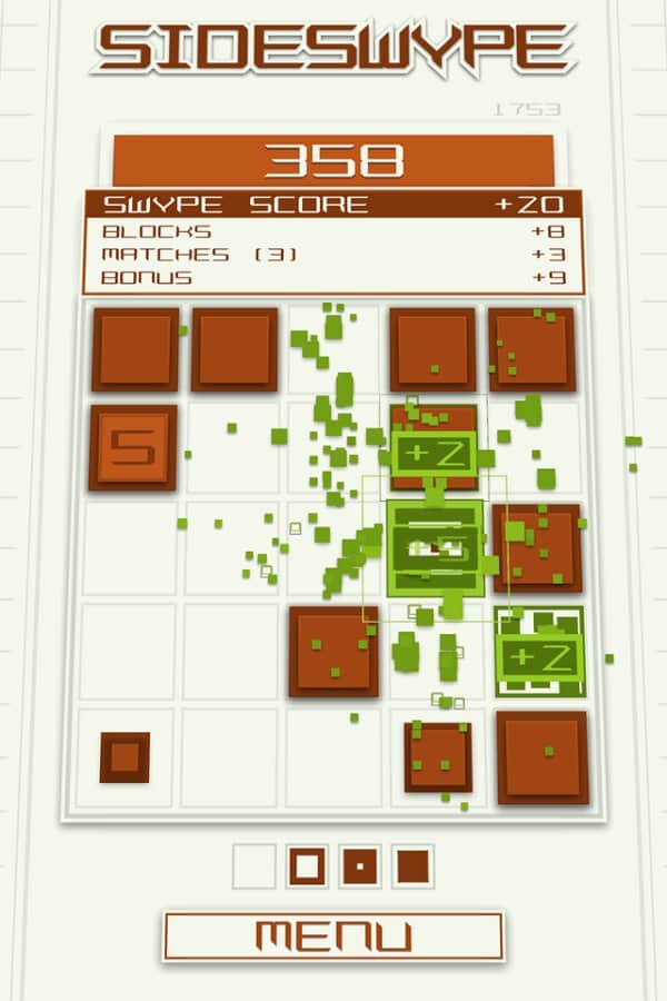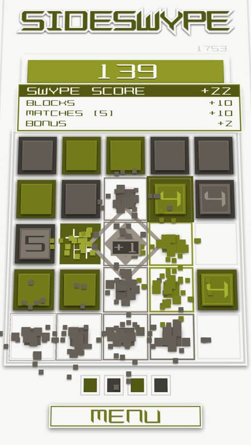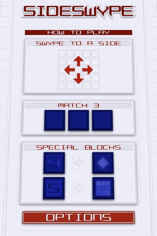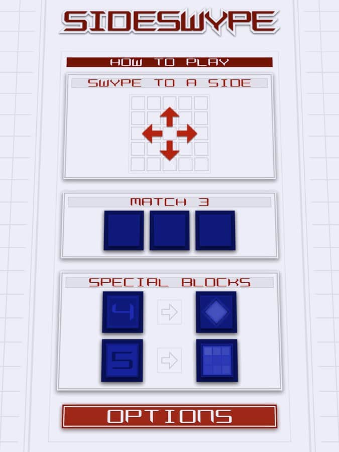 SideSwype-красива і мінімалістична гра-головоломка від творців Slydris. Рухайте пальцем по екрану, щоб відправляти блоки у вільне ковзання в одну з 4-х сторін. З'єднай більше 3-х блоків для їх знищення. Можна зібрати більше 3-х блоків, тоді ви зможете заробити додаткові бонуси. Управління в грі просте і не змусить довго в ньому розбиратися, а приємна медитативна музика дозволить вам порожниною розслабитися. У грі більше 10 різних досягнень, прагніть заробити їх якомога. Виберіть один з 6 колірних схем і 2 оригінальних пісень.