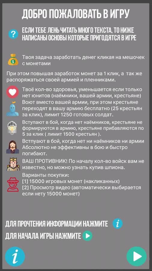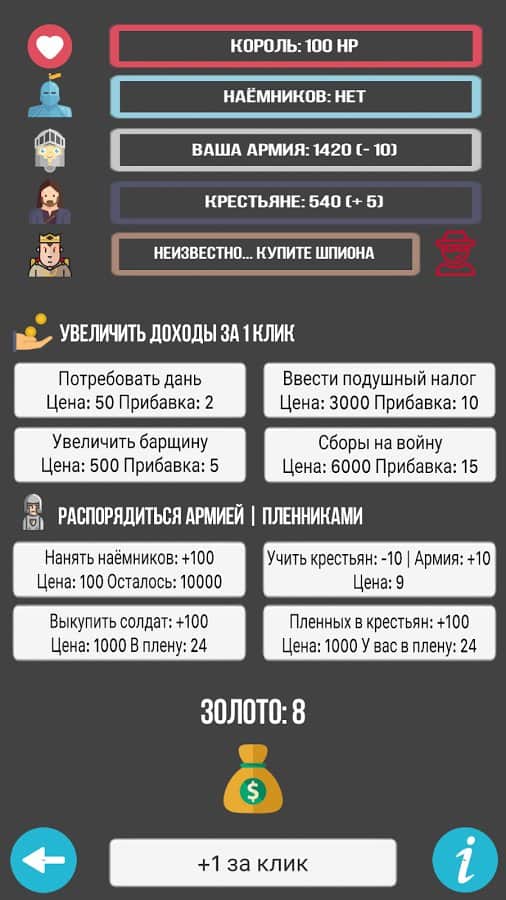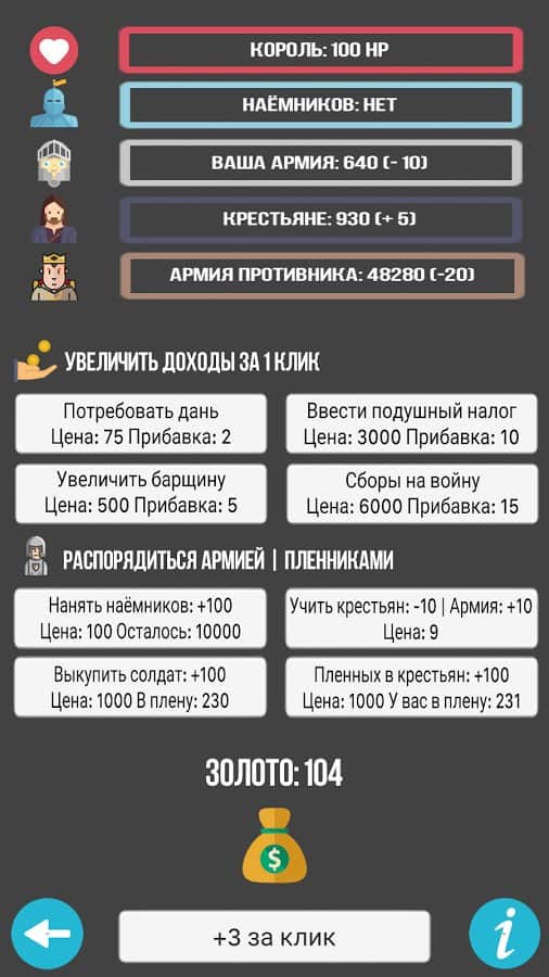 Симулятор Короля – клікер на андроїд, де ви зможете побувати в ролі короля величезної держави. У цій грі вашою головною задачею буде захистити своє королівство від набігів ворогів і при цьому не розорити свою скарбницю. Розробляйте свою стратегію гри, адже від кожного вашого кліка по екрану буде залежати доля всього королівства. Збирати величезну армію воїнів, при цьому наймаючи найманців. Платите солдатам платню з казни, а поповнюйте її шляхом введення нових податків для селян і збору данини. Постійно підвищуйте свої доходи і зменшити витрати на утримання армії. Грайте в цю гру і продумуйте кожен свій крок.