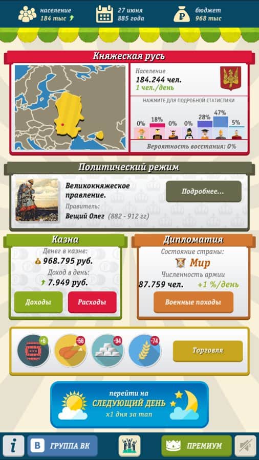 Симулятор Росії / Russian Simulator - В цій грі ви почнете грати з далекого 862 року. З цього року доля Росії буде знаходитися в ваших руках. У грі вам доведеться встановлювати політичні відносини, вести торгівлю, підвищувати або знижувати податкову ставку для свого населення і звичайно ж ввести війну за територію. Дуже часто вам доведеться робити нелегкий вибір, який вплине на розвиток Росії.