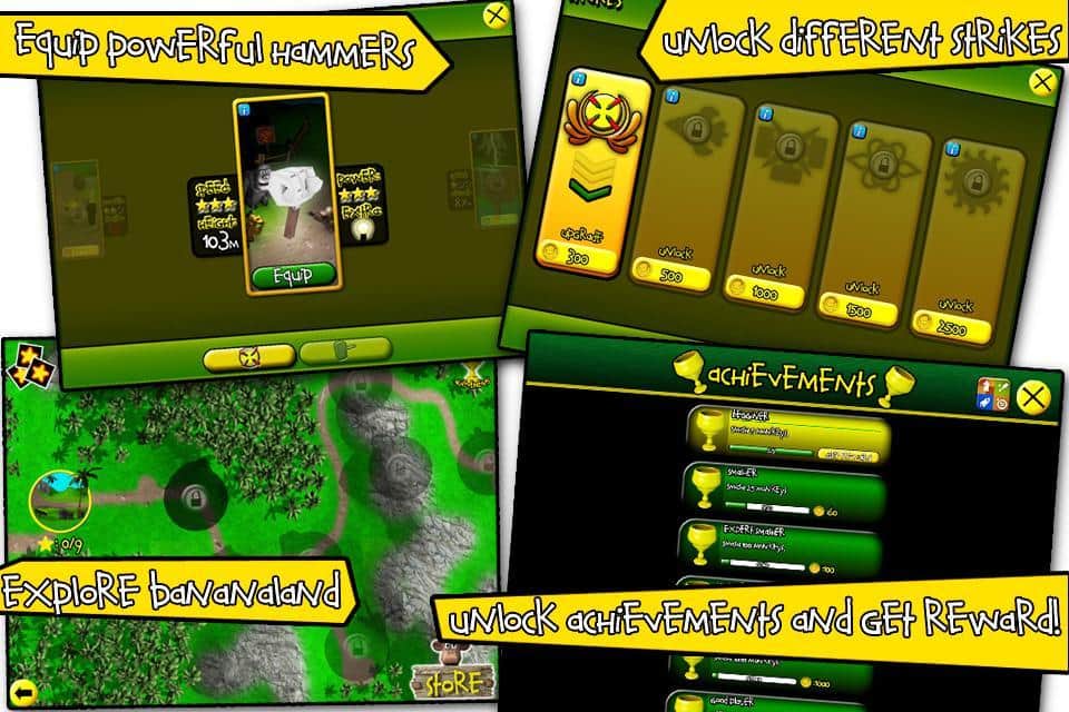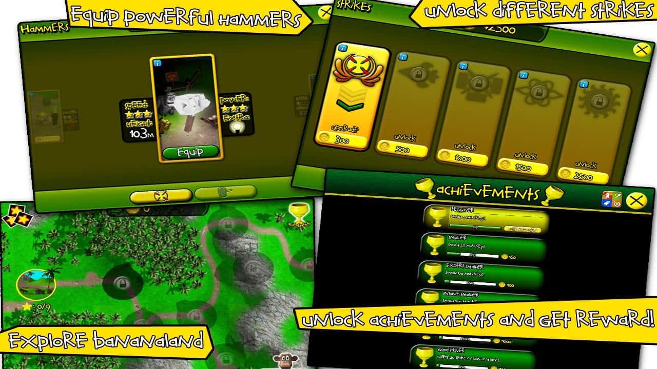 Smash The Monkey - Веселая аркада на андроид, в которой вам предстоит бить молотком. Одну забавную обезьянку обидели, забрали повозку с ее бананами. Теперь она разозлилась и бьет всех подряд большим молотком, лишь бы ее бананы вернули. Всего в игре пятьдесят один уровень в семнадцати различных мирах. А для тех, кто неплохо знает английский язык между уровнями их будут развлекать юмористические рассказы.