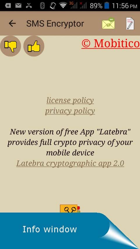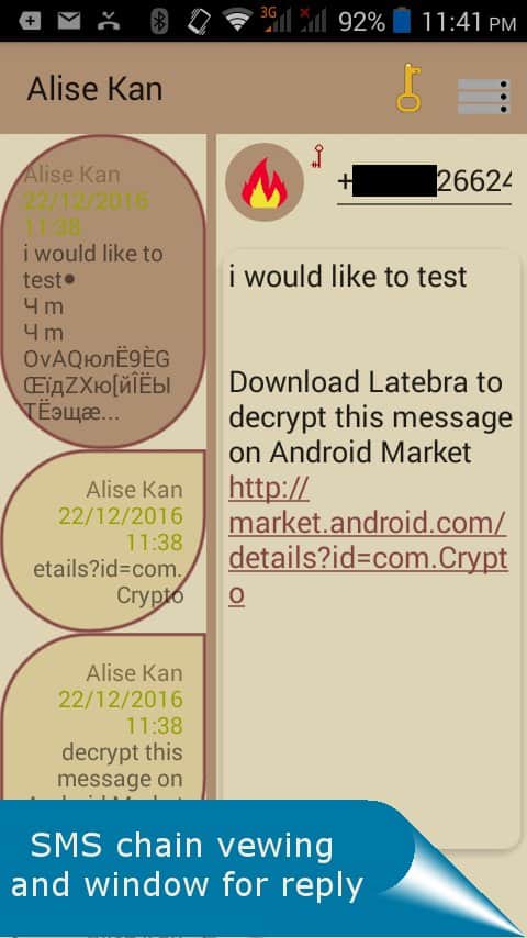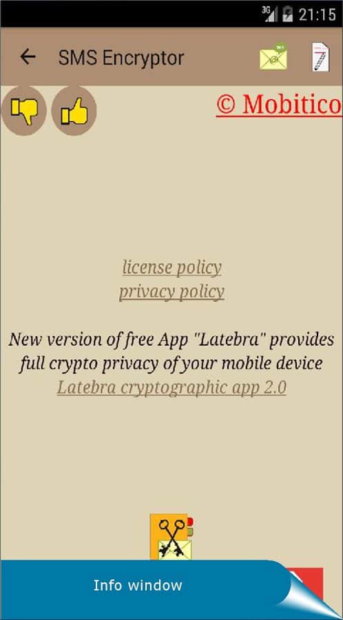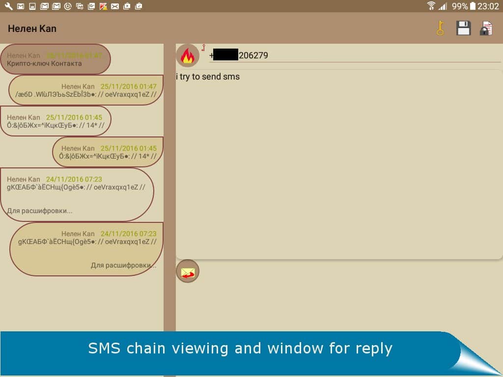 SMS Encryptor - Боїтеся що хтось зможе прочитати ваші смс? Тоді це додаток допоможе вам убезпечити себе. Це додаток створює крипто-ключ, за допомогою якого адресат зможе відкрити саме повідомлення. Для того що б вам було зручніше розробники зробили власний клієнт для повідомлень, він дуже простий і зручний, має гнучкий інтерфейс і списки контактів.