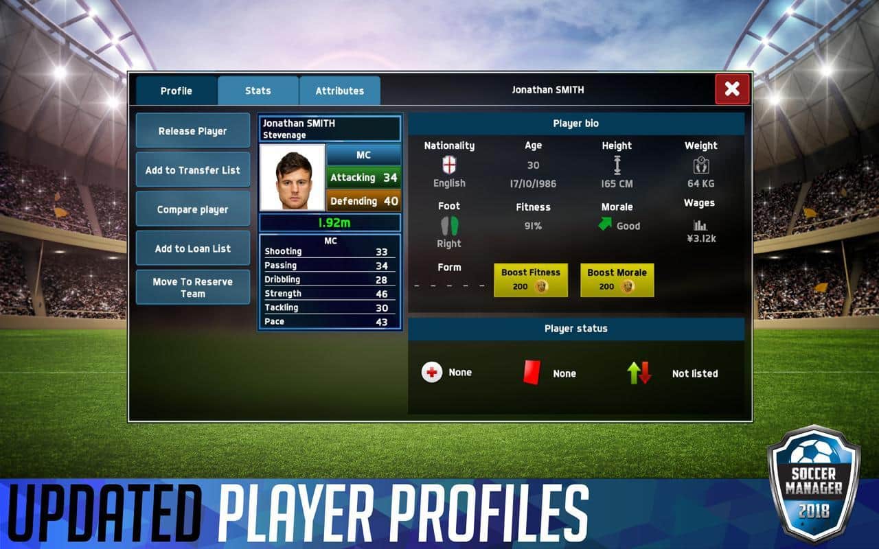 Soccer Manager 2018 – симулятор футбольного менеджера на андроїд, де ви будете грати футбол. Візьміть під свій контроль дивізіону клубу і проявіть всі свої навички управління командою домагаючись найкращих результатів. Приведіть свою команду до перемоги, беручи участь у різних чемпіонатах і граючи в 35 країнах світу. Тренуйте свою команду, купуйте нових здатних гравців і створіть свою непереможну команду. Гра порадує вас глибокої системою навчання, де ви зможете вибрати атрибути, ті які ви хочете, щоб ваша команда покращила і підвищити їх продуктивність.
