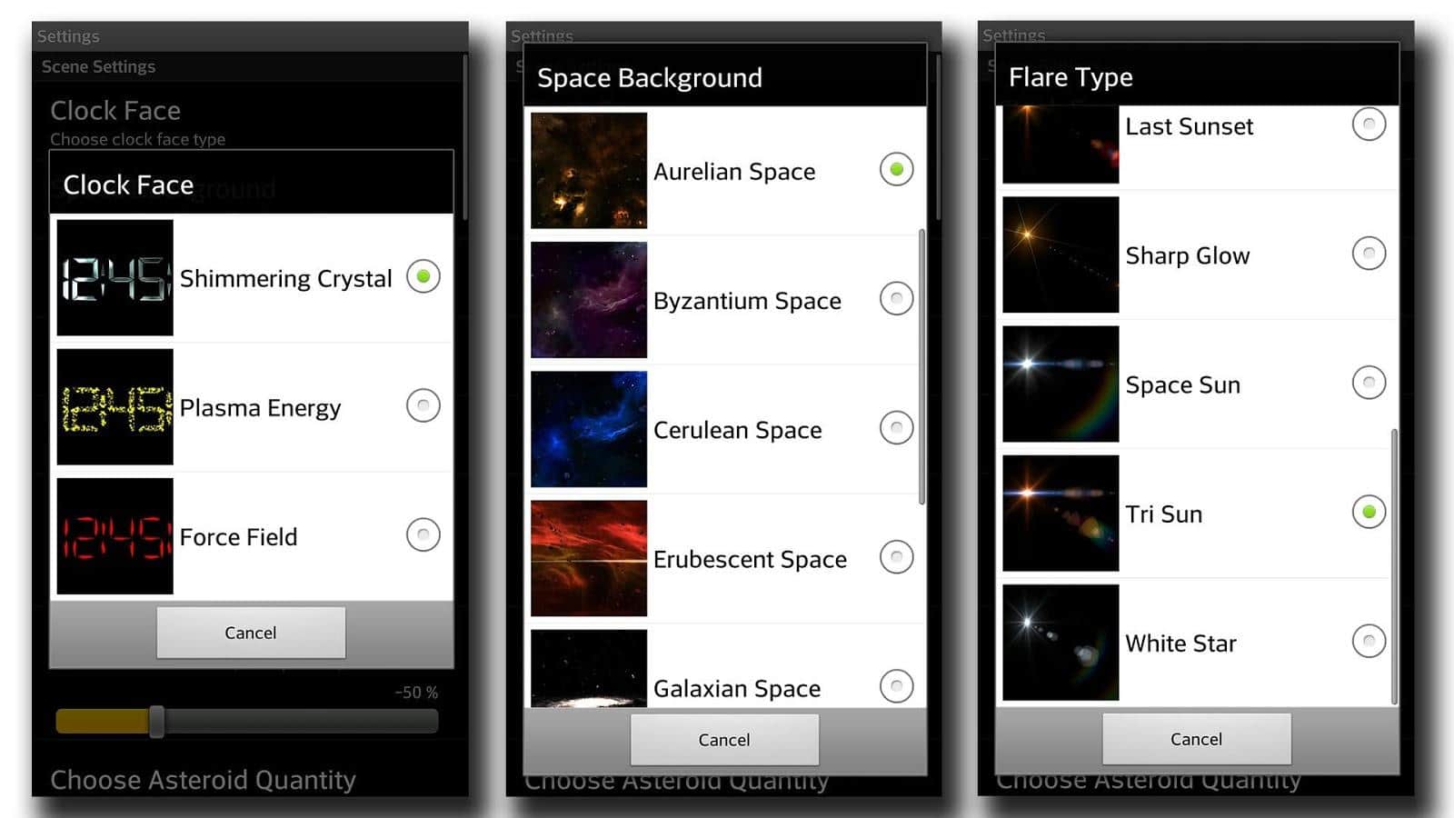 Space Clock 3D Pro LWP - це дійсно якісно виконані живі шпалери з годинником. Красиво анімовані годинник, вид яких може змінюватися на: «сяючий кристал», «енергії плазми» і «силове поле». За годинами розташовується фон який так-же можна міняти по вашому розсуду. Всього близько десяти декорацій відмінно поєднуються з годинником. Сонце на тлі так-же може бути змінено на один з 9 видів. У налаштуваннях шпалер так-же можна включити астероїди, космічну пил. Налаштувати зміни камери та багато іншого. Шпалери оптимізовані під телефони що підтримують OpenGL ES 2.0