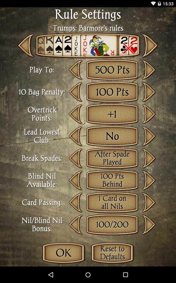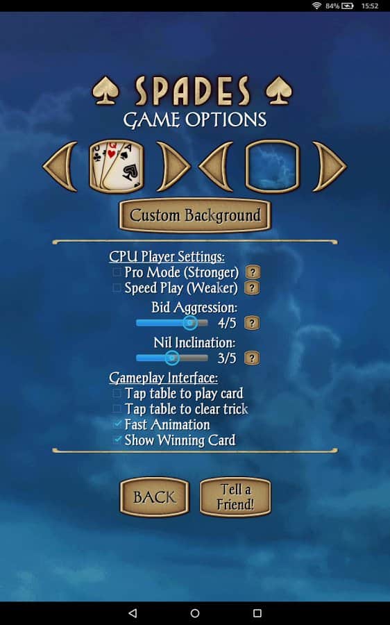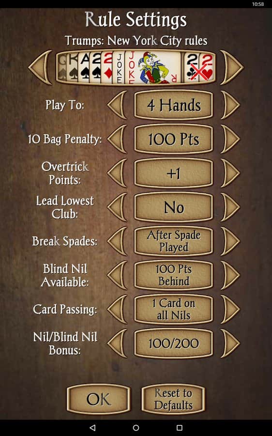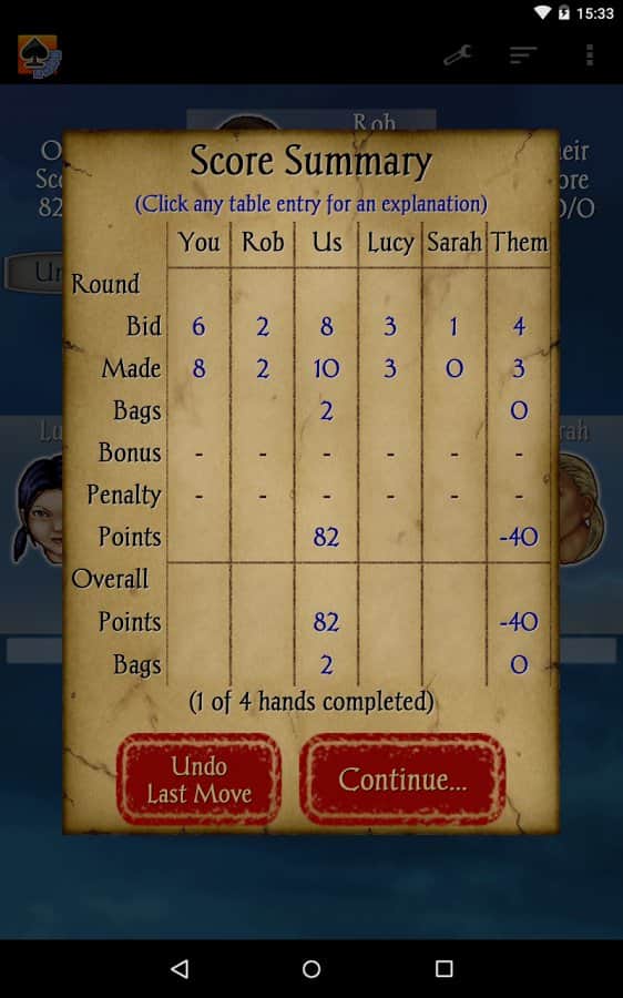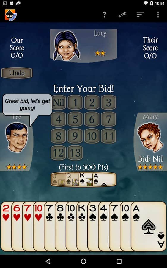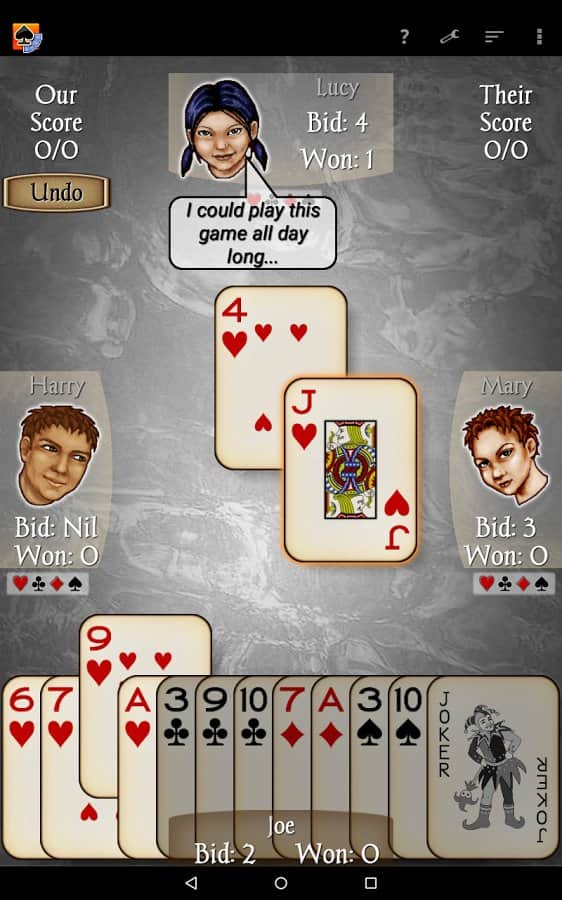 Spades - android версія популярної карткової гри, яка в народі називається просто Черв'яки. Правила оригінальної настільної гри дуже прості і широко всім відомі, при цьому цифрова версія обзавелася цілим рядом нововведень, як у відношенні кількості гравців, так і кілька перероблених правил. В іншому Spades це все ті ж Черв'яки. Дана гра допоможе вам скоротати вільний час в черзі або по дорозі на роботу, при цьому простенькі правила і нехитрий геймпей не зажадає від вас зусиль, а хороша графіка додасть процесу ще більшого інтересу.