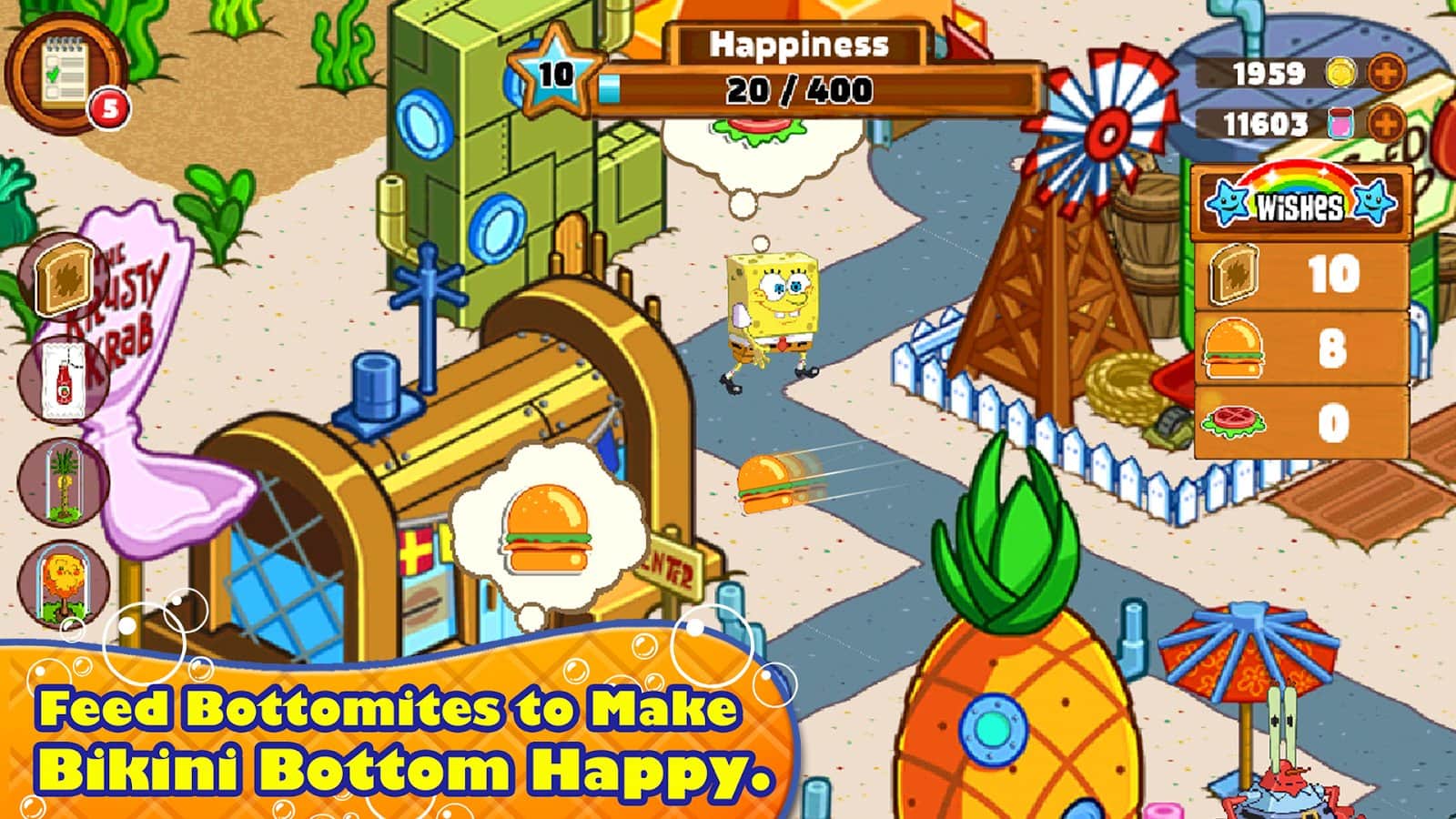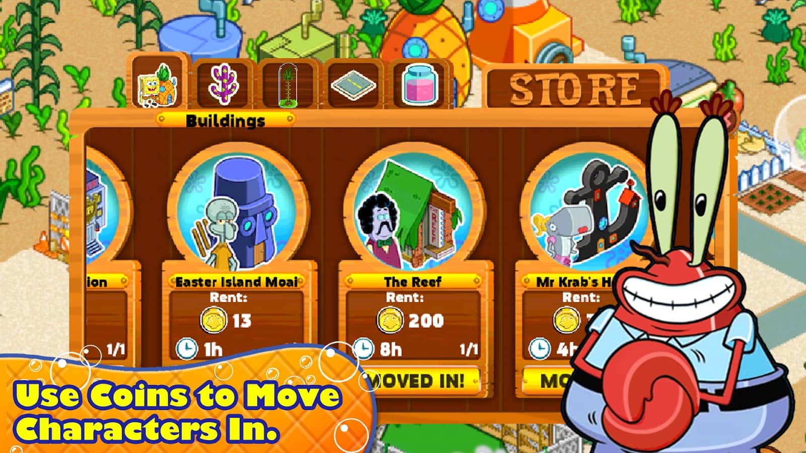 Губка Боб: мой Бикини Боттом (SpongeBob Moves In) - удивительная стратегия на на адроид про полюбившегося героя подводного мира, а именно Губки Боба. Ваша задача построить настоящий подводный город. А помогут вам в этом герои мультфильма. Цель игры – добиться определенного уровня радости. Когда вы набираете нужное количество, вы переходите на следующий уровень. В игре есть внутренняя валюта, собирайте монеты, за них вы можете строить здания и покупать всякую мелочь.