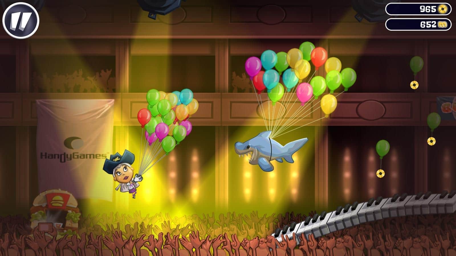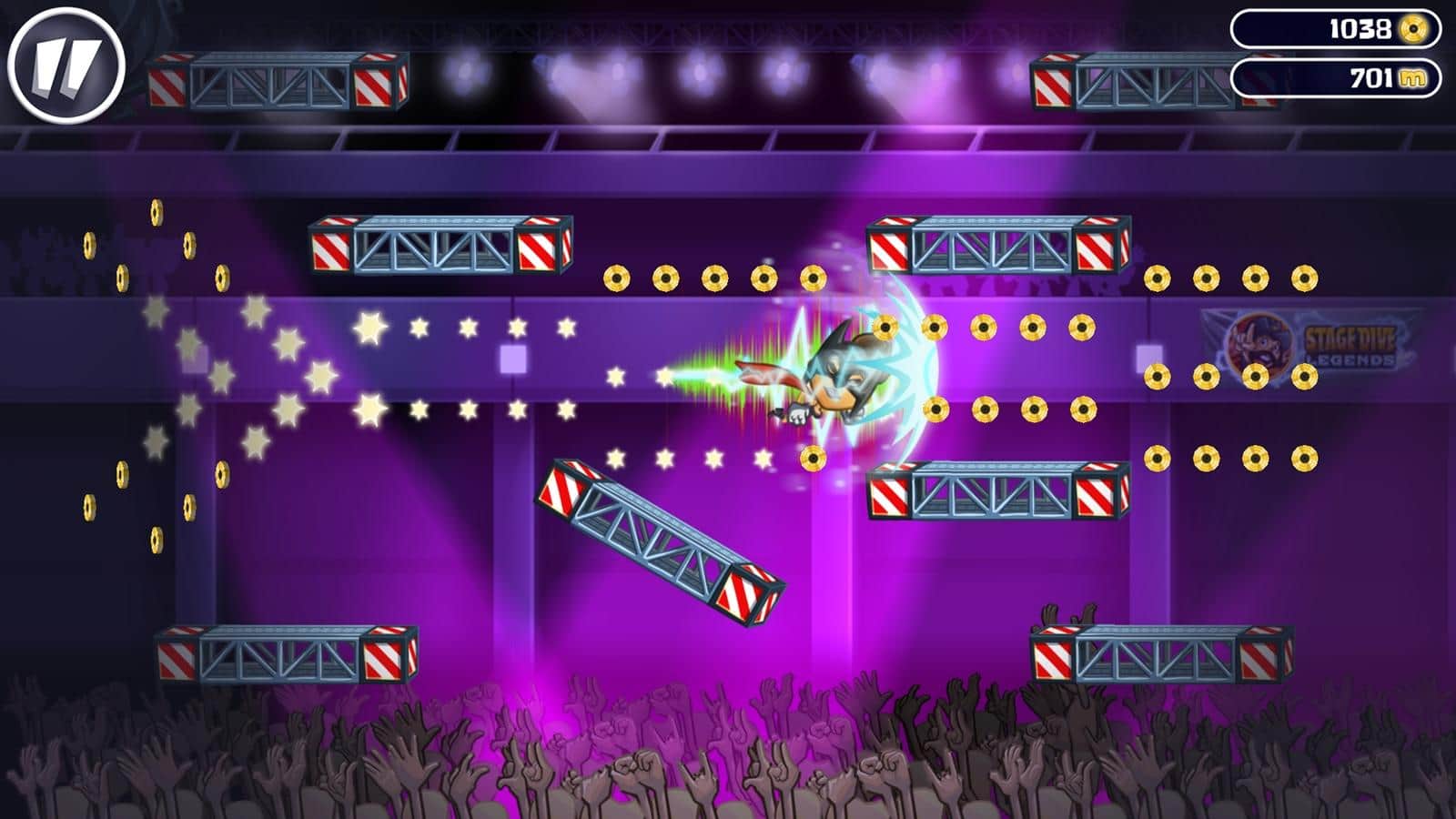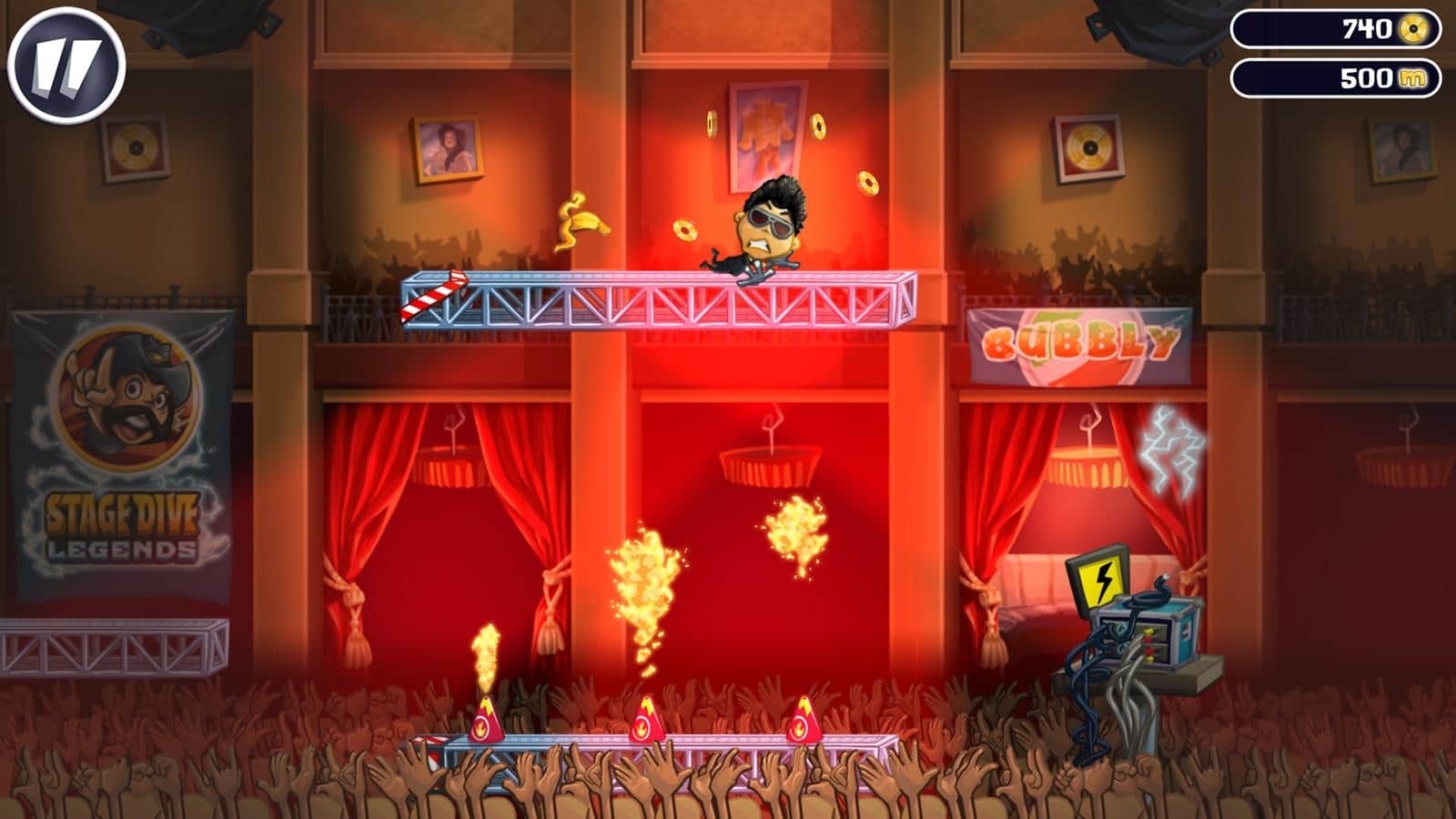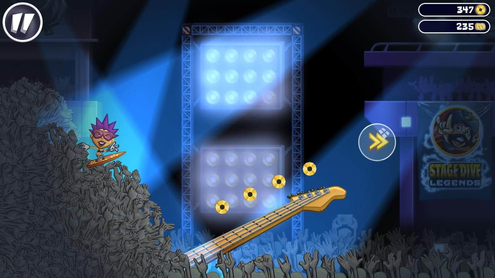 Stage Dive Legends – музыкальная игра в которой вам предстоит отправиться в захватывающее путешествие по различным странам со своими концертами. В этой игре вы будете играть за рок звезду, которая отправилась в турне по большим городам таким как: Нью-Йорк, Лондон, Берлин и Париж. Вас ждет фееричное шоу с разбиванием гитары и прыжками в толпу. Устройте серфинг, катаясь по залу на своих поклонниках, и собирайте по пути золотые монетки, а также выполняйте опасные трюки и развеселите свою толпу зрителей. Это веселая игра заставит вас изрядно потрудиться, ведь в ней вам предстоит преодолевать различные препятствия, в виде кожуры от бананов и недоеденных гамбургеров.