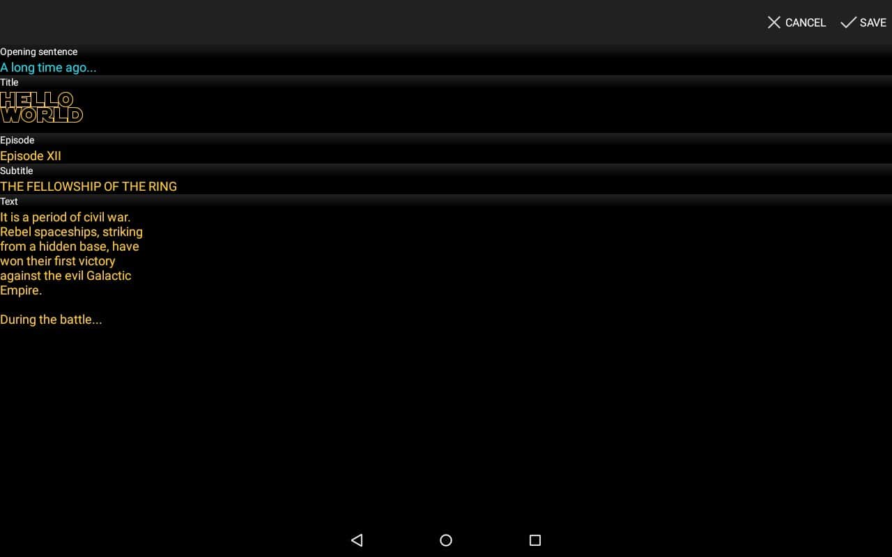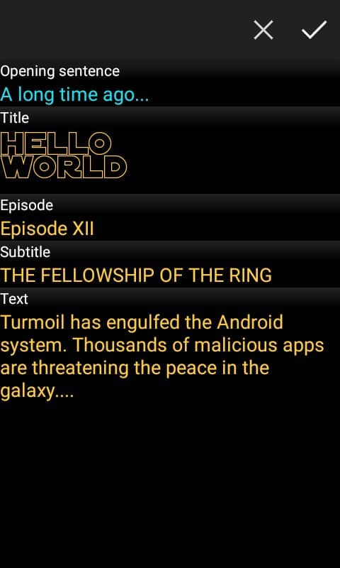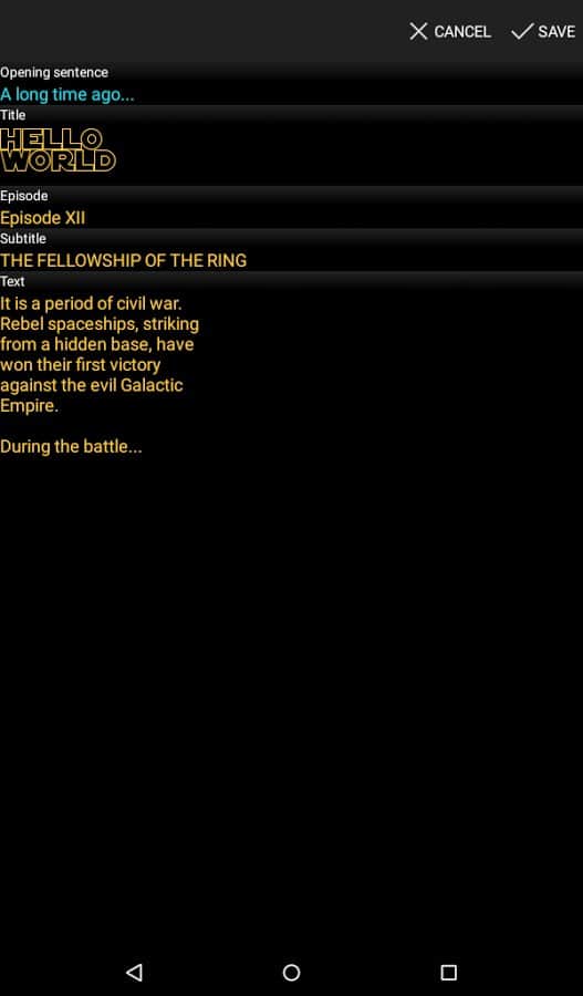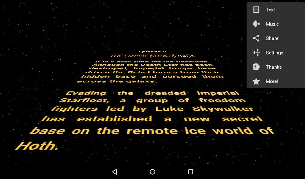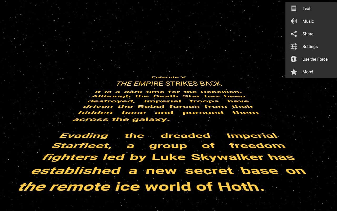 Star Words - Багато хто з нас є фанатами серії Star Wars, і однією унікальною частиною є титри, ті самі які спливають далеко до зірок, і все це на тлі космосу. Тепер у вас є можливість створити точно такі ж титри, тільки при цьому можна буде замінити текст, а так само деякі деталі. Накидайте свій власний текст, встановіть швидкість прокрутки, а потім у пару косаний надішліть цей кліп своїм друзям в соціальні мережі, це звичайно дуже просто і дуже забавно.
