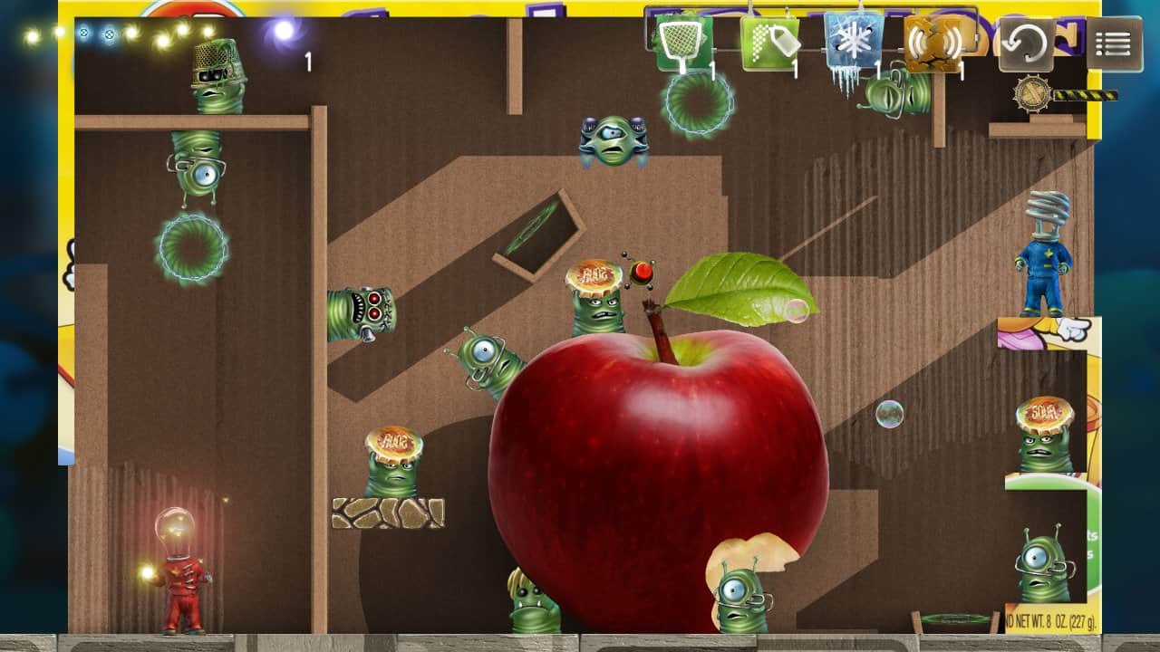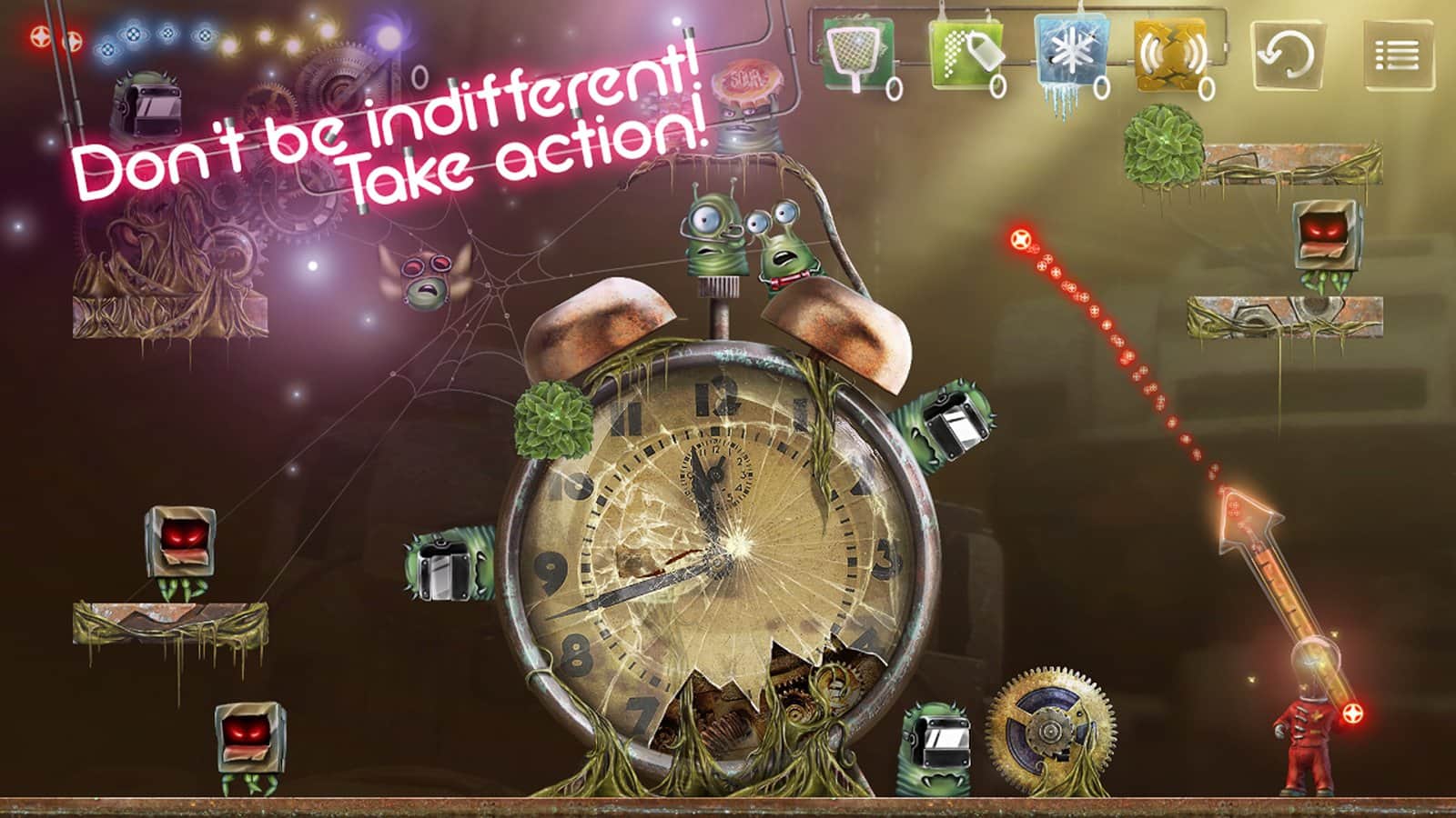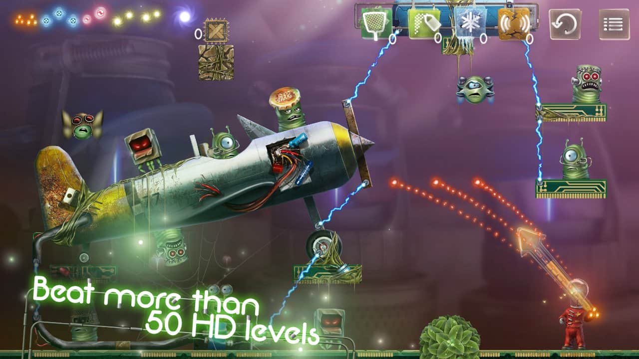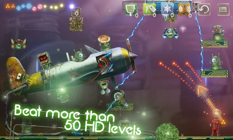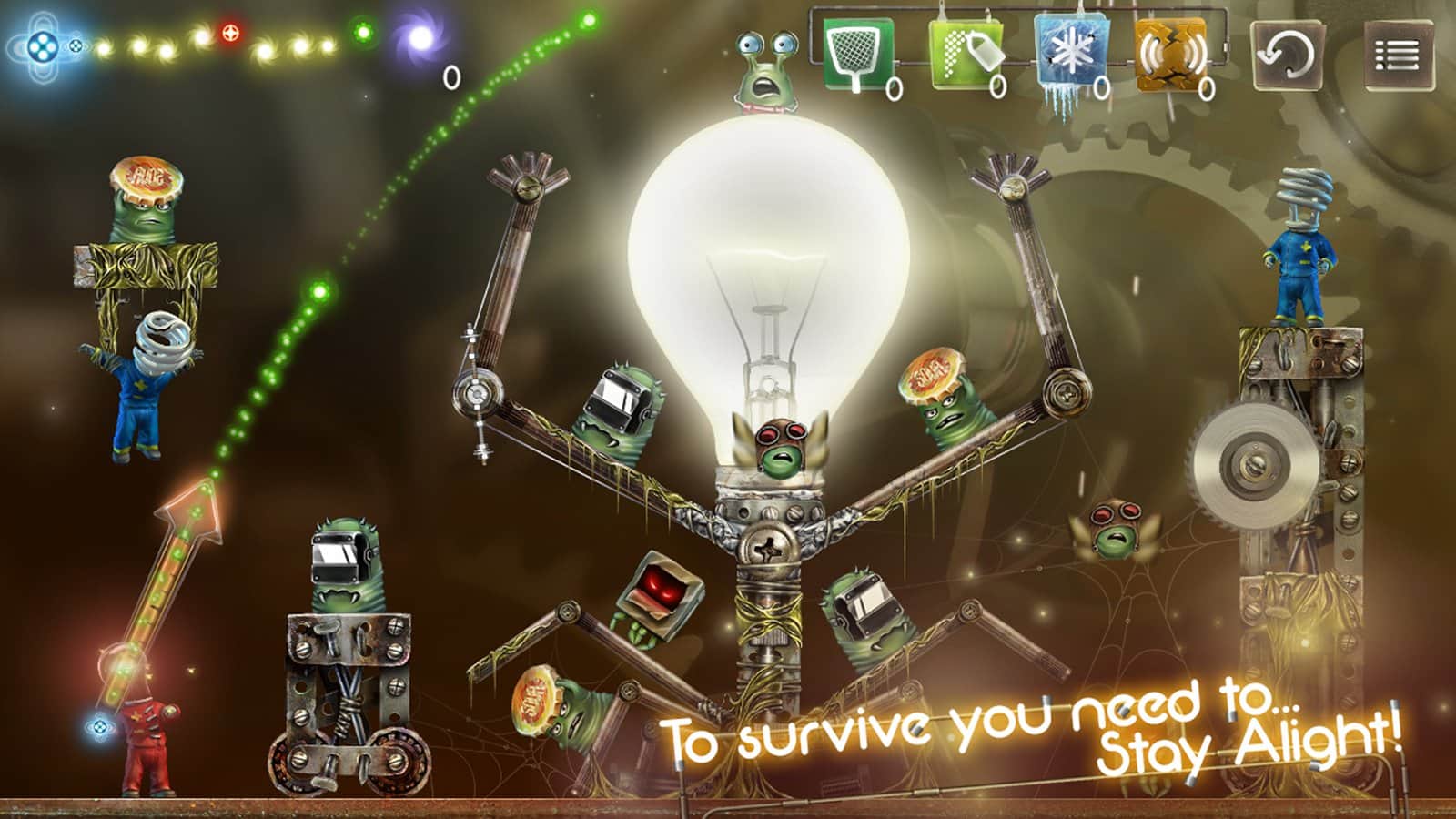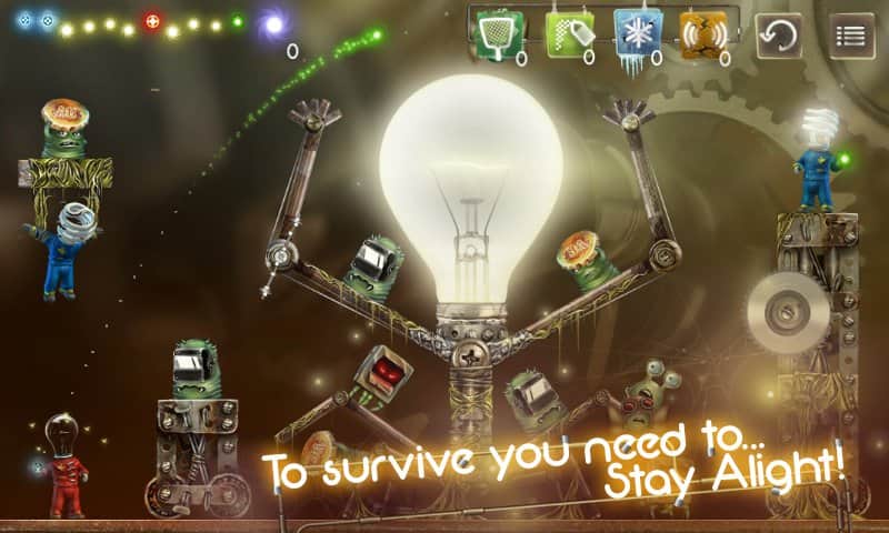 Stay Alight - интересная аркада для андроид познакомит вас с необычным миром человечков-лампочек. Они похожи на людей, только вместо головы у них лампочки. Их жизнь также похожа на земную, вообщем практически собратья. И вот на этих существ напали зеленые монстры. Но отважные лампочки не растерялись и решили дать достойный отпор захватчикам. Для этого нужно запустить во врага лампочку, при этом надо учесть силу удара и траекторию полета, т.е. задать направление. Все 60 уровней борьбы с пришельцами вы будете снабжены не только лампочками, но и супер оружием - замораживанием и землетрясением, что очень поможет вам в трудную минуту.