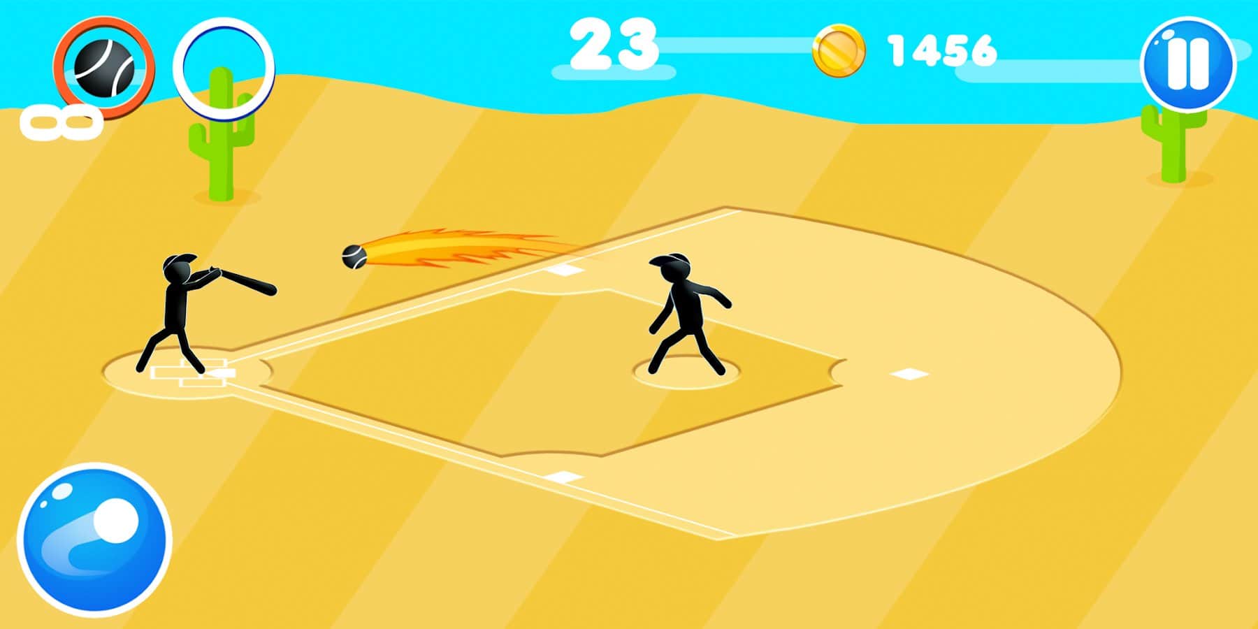 Stickman Baseball – спортивна гра на андроїд, де ви будете грати в бейсбол. Візьміть під свій контроль стикмена і бийте по м'ячу битою, відправляючи м'яч в політ, домагаючись відмінних результатів. Натискайте на екран в потрібний момент і наносити удари битою як можна сильніше, так щоб м'яч пролетів як можна більшу відстань, встановлюючи свій рекорд у цій грі. Змагайтеся з іншими гравцями і заробляйте монетки, піднімаючись все вище в таблиці лідерів. Оновлюйте свої біти, які дозволять вам як можна сильніше вдарити по м'ячу і добитися відмінних результатів.