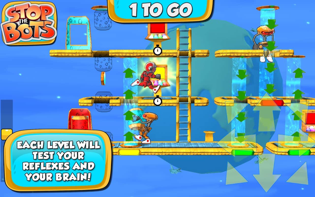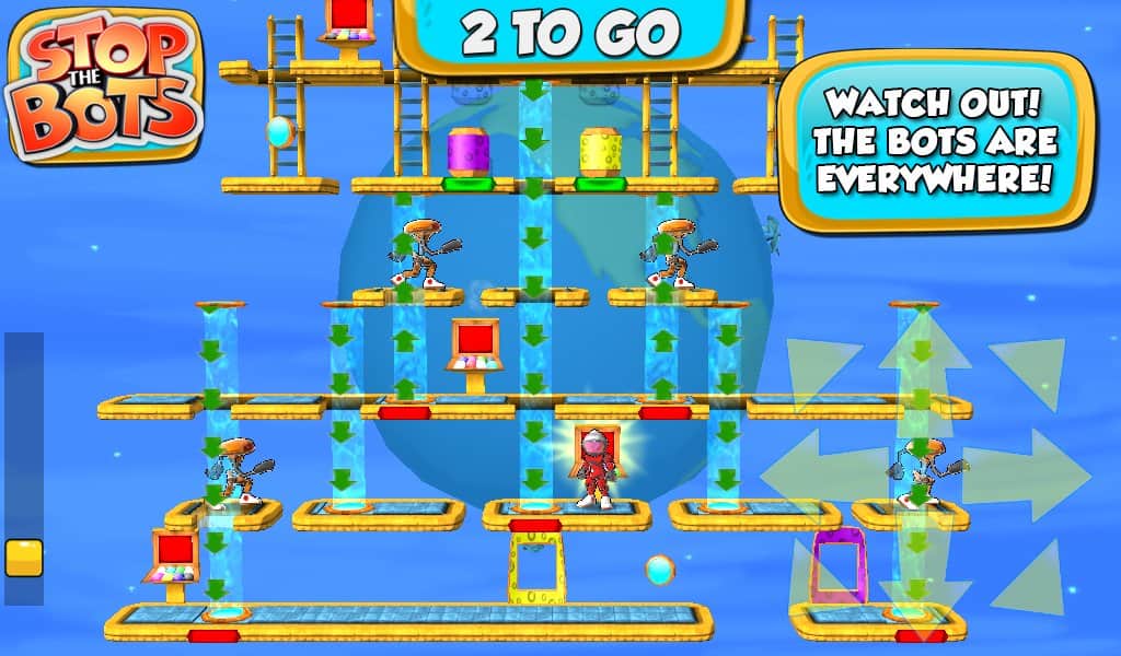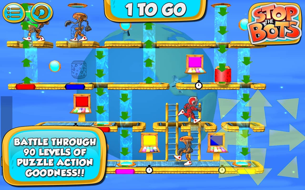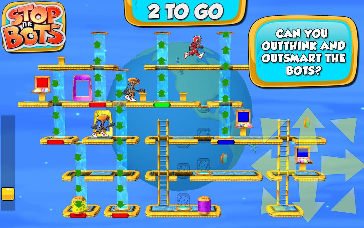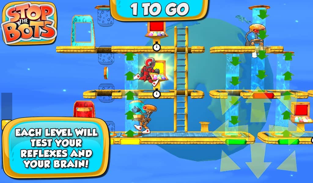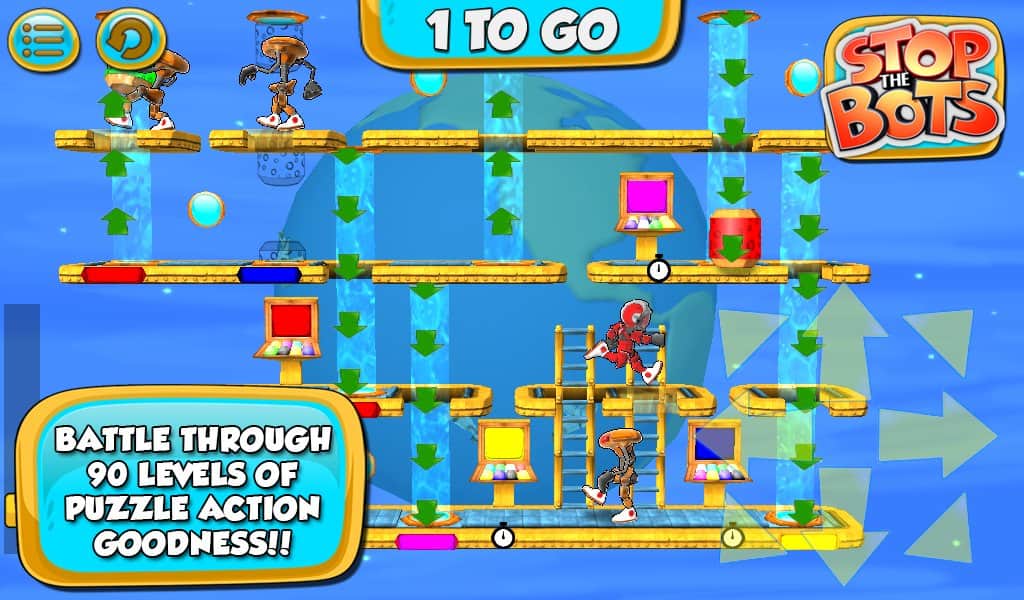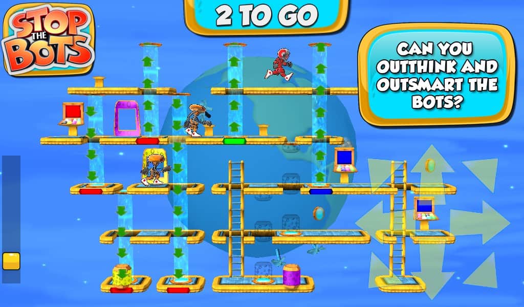 Stop the Bots - игра головоломка, в которой вам предстоит отключить корабль инопланетного робота для того, чтобы он не напал на планету Земля. Ходите по различным уровням и собирайте нужные вам детали быстрее робота, который будет следовать за вами по пятам. Игра сочетает в себе головоломку с аркадными действиями, где вам на протяжении 90 уровней придется обходить препятствия и избегать встречи с роботом.