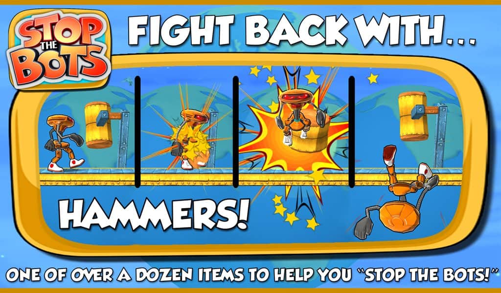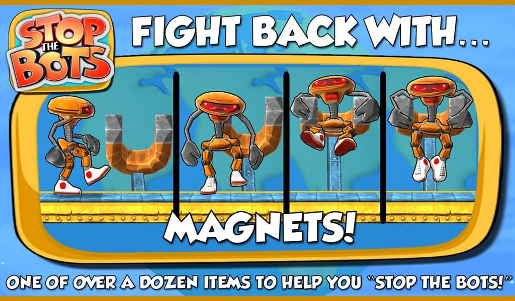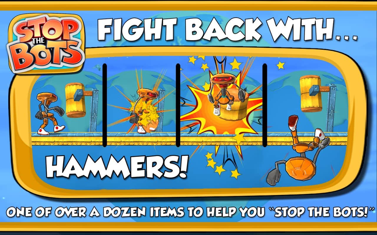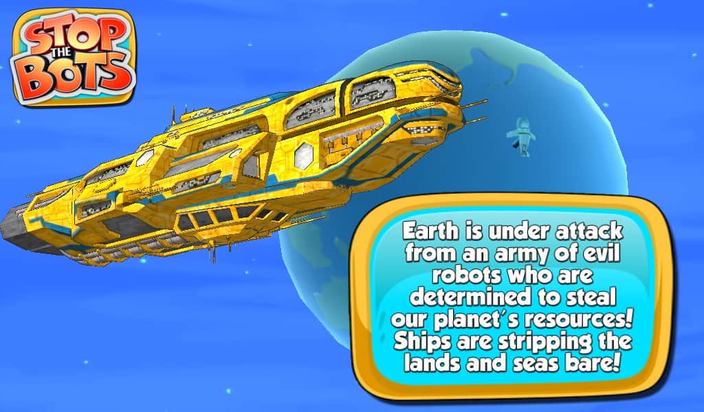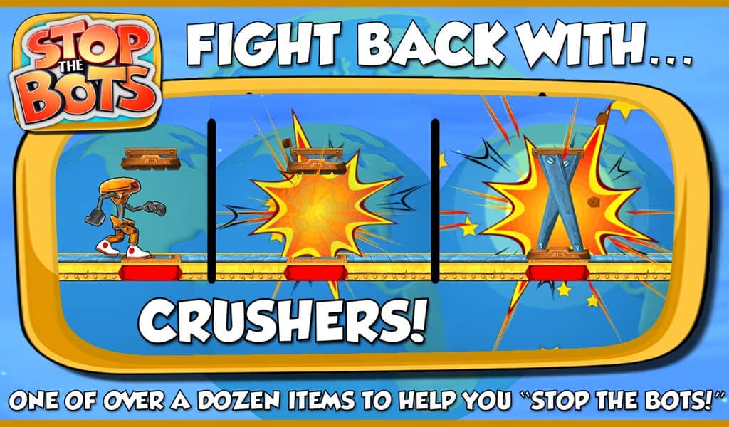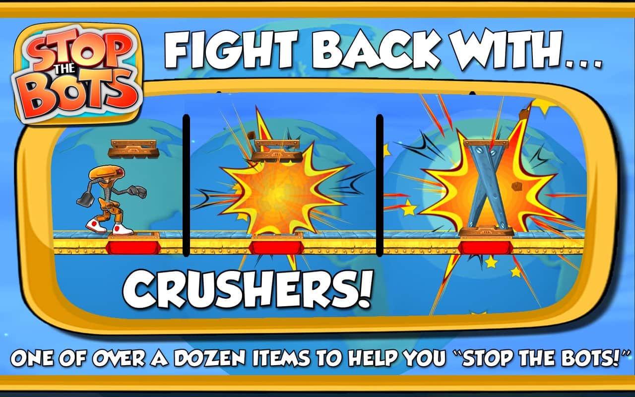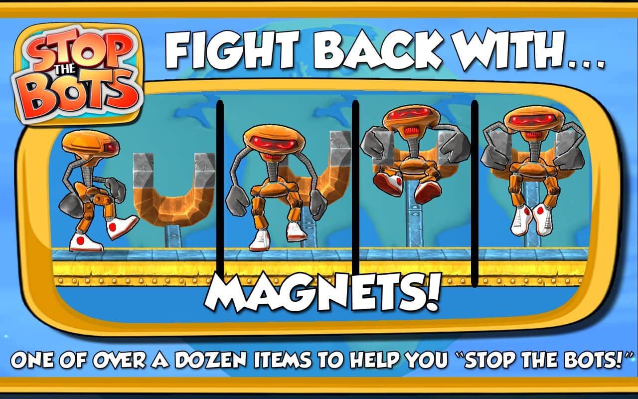 Stop the Bots - игра головоломка, в которой вам предстоит отключить корабль инопланетного робота для того, чтобы он не напал на планету Земля. Ходите по различным уровням и собирайте нужные вам детали быстрее робота, который будет следовать за вами по пятам. Игра сочетает в себе головоломку с аркадными действиями, где вам на протяжении 90 уровней придется обходить препятствия и избегать встречи с роботом.